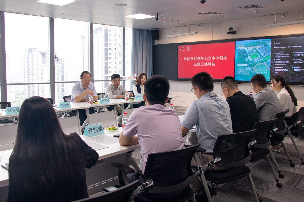 10月13日,國華紀(jì)念中學(xué)校長季德華一行來到云蝶科技總部,與云蝶科技總裁田雪松、副總裁陳天、副總裁藍(lán)維維等共同交流信息技術(shù)輔助教育教學(xué)的實踐工作。