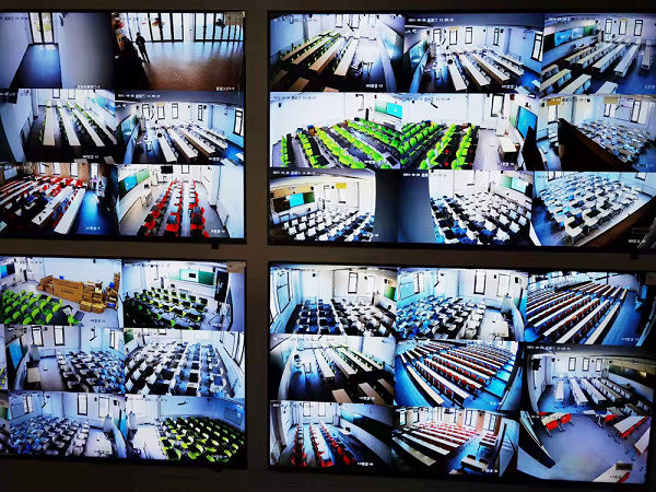 除了教室管理,學(xué)校還建設(shè)有智能控制管理中心。通過接入教室攝像頭、錄播攝像頭,將上課畫面、監(jiān)控畫面實(shí)時(shí)呈現(xiàn)在控制管理中心大屏上,老師可以在這里進(jìn)行教學(xué)巡視、聽課評(píng)課、考試巡查、視頻監(jiān)控和應(yīng)急指揮等等。