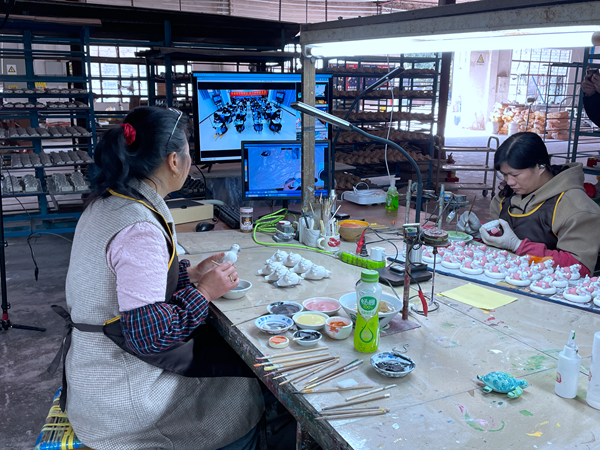 在小鎮(zhèn)中,非遺技藝傳承人展開了傳統(tǒng)技藝的教學。在陶瓷坯體上,教師耐心地勾勒著細節(jié),不同的顏色被一點點涂抹到陶瓷上,展現(xiàn)出了藝術的美麗。