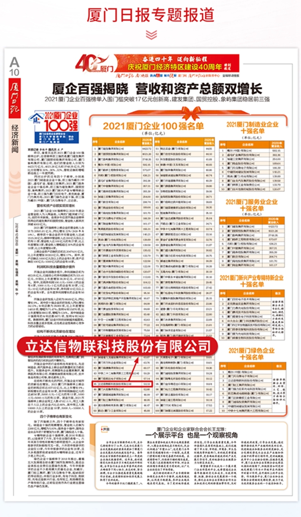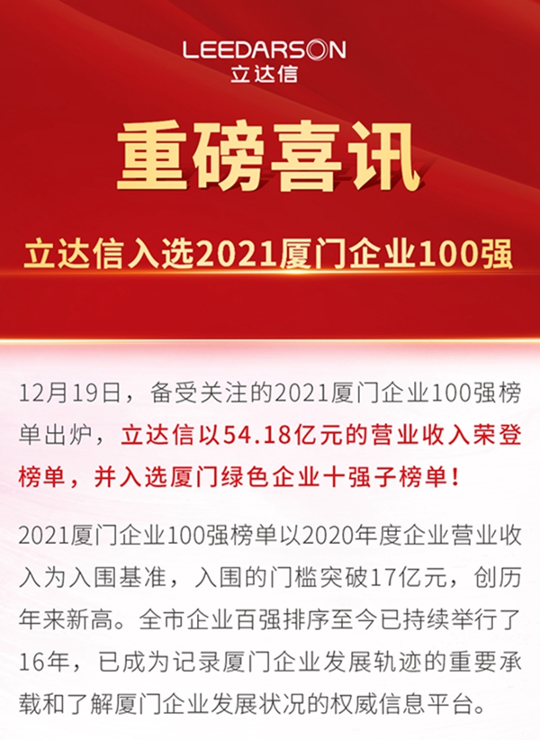 54.18億元!立達(dá)信入選2021廈門企業(yè)100強(qiáng)、廈門綠色企業(yè)十強(qiáng)!