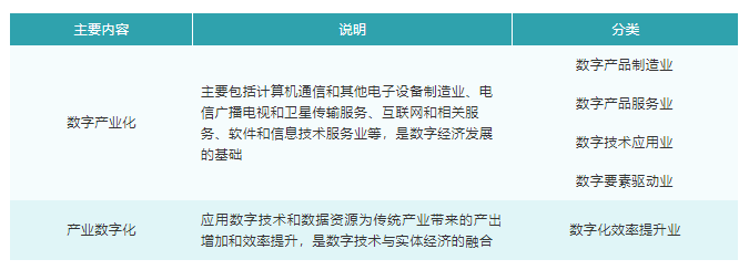 在去年國家統(tǒng)計(jì)局公布的《數(shù)字經(jīng)濟(jì)及其核心產(chǎn)業(yè)統(tǒng)計(jì)分類(2021)》中,明確了數(shù)字經(jīng)濟(jì)的定義和主要內(nèi)容:數(shù)字經(jīng)濟(jì)是指以數(shù)據(jù)資源作為關(guān)鍵生產(chǎn)要素、以現(xiàn)代信息網(wǎng)絡(luò)作為重要載體、以信息通信技術(shù)的有效使用作為效率提升和經(jīng)濟(jì)結(jié)構(gòu)優(yōu)化的重要推動(dòng)力的一系列經(jīng)濟(jì)活動(dòng),其主要內(nèi)容包含“數(shù)字產(chǎn)業(yè)化”和“產(chǎn)業(yè)數(shù)字化”兩方面。