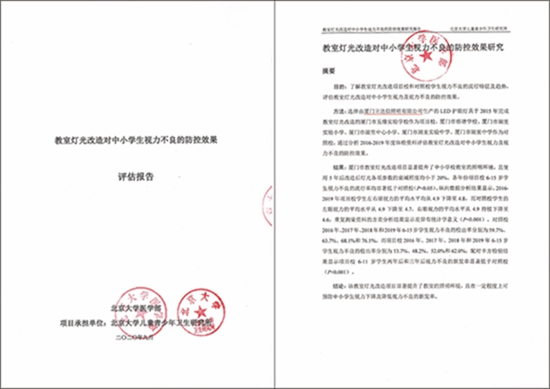 2018年,北京大學(xué)醫(yī)學(xué)部、北京大學(xué)兒童青少年衛(wèi)生研究所(國(guó)標(biāo)GB7793-2010《中小學(xué)校教室采光和照明衛(wèi)生標(biāo)準(zhǔn)》、國(guó)標(biāo)GB40070-2021《兒童青少年學(xué)習(xí)用品近視防控衛(wèi)生要求》主起草單位)出具的權(quán)威報(bào)告顯示:立達(dá)信健康光環(huán)境改造項(xiàng)目顯著提升了教室的照明環(huán)境,在一定程度上可預(yù)防中小學(xué)生視力下降和降低不良視力的新發(fā)率。