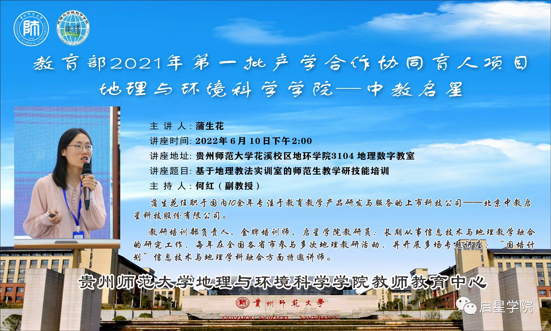 第一站我們來到貴州師范大學(xué)。6月10日,中教啟星蒲生花老師受邀到貴州師范大學(xué)地理與環(huán)境科學(xué)學(xué)院,參加中教啟星與貴州師范大學(xué)產(chǎn)學(xué)合作協(xié)同育人項目的啟動,這個項目也是目前產(chǎn)學(xué)合作項目的第一講。