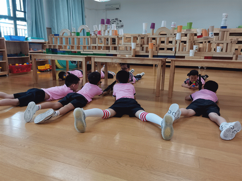 只見他們在建構(gòu)區(qū)收集了好多長方體和圓柱體的積木,陳正欽負責(zé)指揮,其他幼兒一起合作拼搭。他們會搭什么呢?我正思考著,不一會兒,他們搭好了一座結(jié)實的“城墻”,所有人開心地跳躍起來,然后開始了他們的第二場打仗游戲。