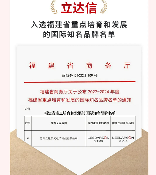 同在近期,福建省商務(wù)廳正式公布了“2022-2024年度福建省重點(diǎn)培育和發(fā)展的國際知名品牌名單”,立達(dá)信憑借在照明及物聯(lián)網(wǎng)領(lǐng)域雄厚的研發(fā)創(chuàng)新能力、全球營銷服務(wù)能力和行業(yè)領(lǐng)先的生產(chǎn)制造能力,第三次榮獲入選。該項(xiàng)目是迄今為止福建省為數(shù)不多的官方在評品牌類獎項(xiàng)之一。