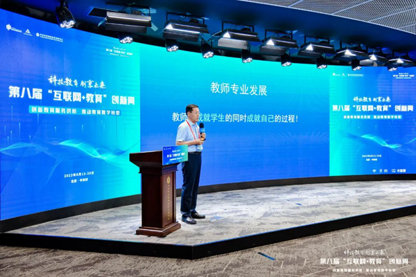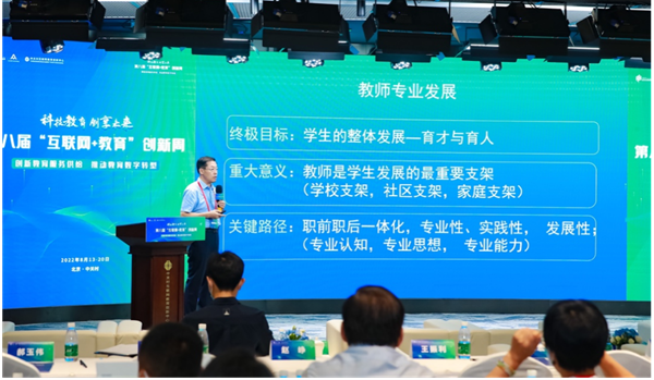 “教育數(shù)字化背景下,教師專業(yè)發(fā)展更依賴數(shù)字化應(yīng)用和工具,為教師提供支持教學(xué)、教研、學(xué)生評價、資源建設(shè)和自身成長需要且易用、體系化的硬件工具和應(yīng)用系統(tǒng),將有力推動教師隊伍的整體質(zhì)量向前一步!蔽赫袼谥黝}演講中提出。