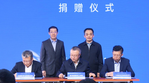 (教育部教師工作司司長(zhǎng)任友群、視?萍几笨偛么迍、中國(guó)教育發(fā)展基金會(huì)秘書(shū)長(zhǎng)王建光進(jìn)行三方代表簽約)