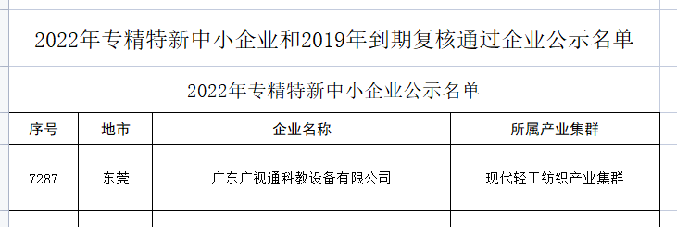 近日,廣東省工業(yè)和信息化廳發(fā)布了《關(guān)于2022年“專精特新”中小企業(yè)和2019年到期復(fù)核通過企業(yè)名單的公示》,廣視通成功入選,順利通過了2022年廣東省“專精特新”中小企業(yè)認(rèn)定。