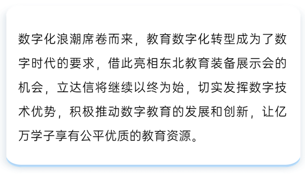 本次展會(huì)立達(dá)信以“硬件全場(chǎng)景、教育大生態(tài)、數(shù)字大平臺(tái)”為核心,緊貼用戶(hù)需求,攜全新的教育照明3.0、智慧教室、健康校園、安全校園、數(shù)字幼教、實(shí)驗(yàn)實(shí)訓(xùn)等全場(chǎng)景數(shù)字教育整體解決方案驚艷亮相,在現(xiàn)場(chǎng)構(gòu)建起科技感滿(mǎn)滿(mǎn)的數(shù)字化教育空間,讓眾多觀展者感受到數(shù)字教育的新形態(tài)和新未來(lái)。