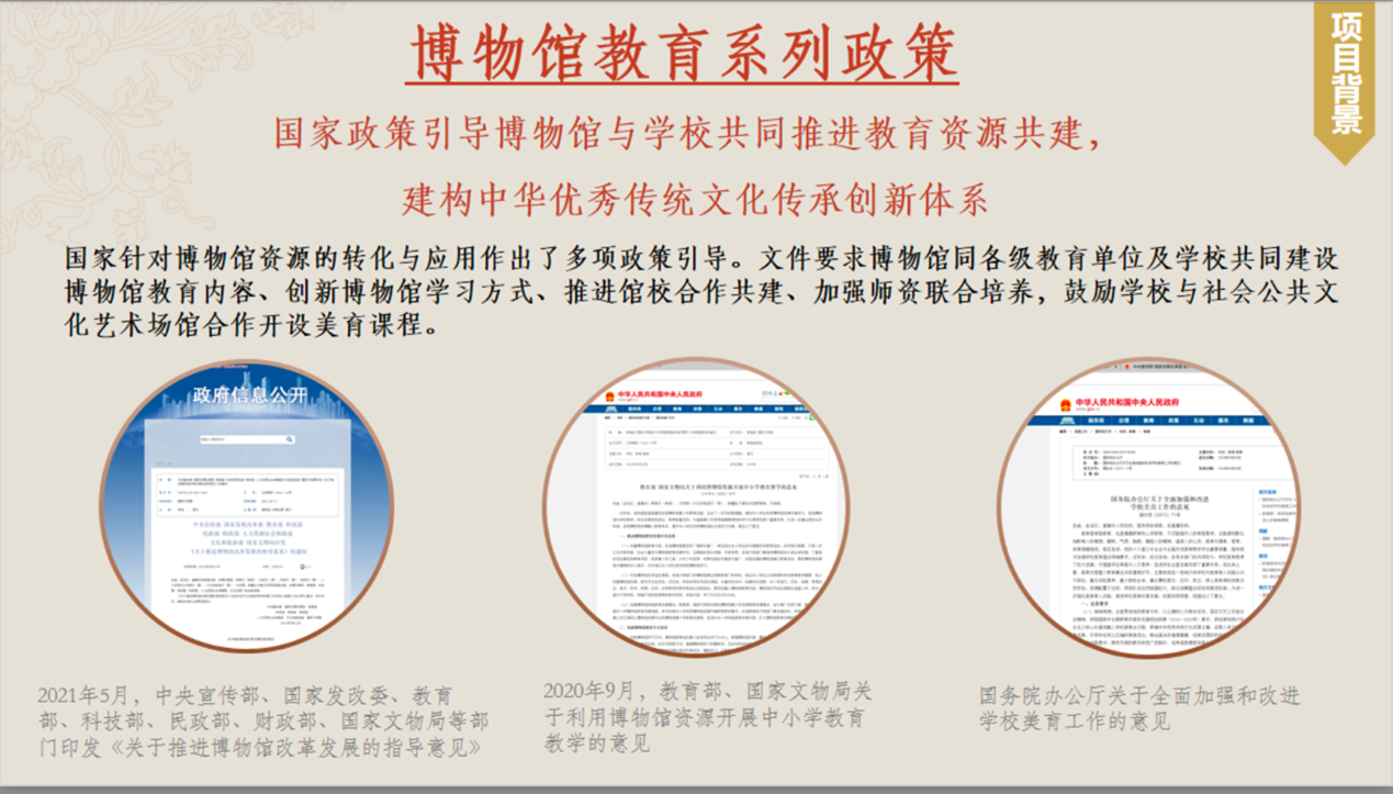 緊接著在文化強(qiáng)國、文化自信和講好中國故事的時代背景下,結(jié)合習(xí)近平總書記“一個博物院就是一所大學(xué)”的講話精神,以及近年教育“雙減政策”下,中小學(xué)對傳統(tǒng)文化綜合素質(zhì)實踐課、勞動課、美育課以及課后三點半教學(xué)等校內(nèi)教育需求,故宮博物院故宮學(xué)校為進(jìn)一步落實“引導(dǎo)博物館與學(xué)校共同推進(jìn)教育資源共建,建構(gòu)中華優(yōu)秀傳統(tǒng)文化傳承創(chuàng)新體系”的國家政策,特開展了青少年博物館在線教育項目,結(jié)合每件藏品的深刻內(nèi)涵設(shè)計成課程,傳播真實、可信、富有情感和生命力的知識內(nèi)容。