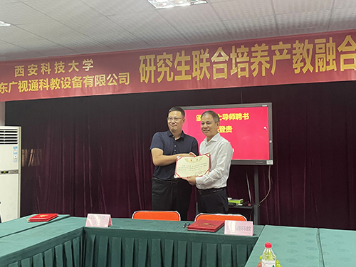 座談會結(jié)束后,西安科技大學(xué)管理學(xué)院副院長鄒紹輝、廣東廣視通科教設(shè)備有限公司董事長陳登貴分別代表雙方簽訂共建“研究生聯(lián)合培養(yǎng)產(chǎn)教融合實踐基地”合作協(xié)議并進(jìn)行授牌,鄒紹輝副院長為陳登貴董事長及實踐基地建設(shè)團(tuán)隊導(dǎo)師頒發(fā)校外碩士導(dǎo)師聘書。