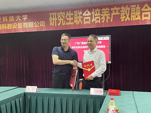 2023年7月8日下午,廣東廣視通科教設(shè)備有限公司與西安科技大學(xué)“研究生聯(lián)合培養(yǎng)產(chǎn)教融合實踐基地”簽約儀式在廣視通大廈二樓會議室舉行。西安科技大學(xué)管理學(xué)院副院長鄒紹輝,西安科技大學(xué)大灣區(qū)研究生聯(lián)合培養(yǎng)產(chǎn)教融合實踐基地導(dǎo)師羅立升,西安科技大學(xué)大灣區(qū)MBA校友會籌備組秘書長、東莞市市場監(jiān)督管理局石排分局同仲強(qiáng),大灣區(qū)西安科技大學(xué)MBA校友會籌備組委員陳桂;特邀嘉賓廣東科技學(xué)院黨委副書記、副校長畢會東,東莞市名校研究生培育發(fā)展中心林洪嘉;公司董事長陳登貴、副總經(jīng)理吳斌華、副總經(jīng)理潘富兵等出席簽約儀式。由西安科技大學(xué)大灣區(qū)研究生聯(lián)合培養(yǎng)產(chǎn)教融合實踐基地導(dǎo)師羅立升主持簽約活動。