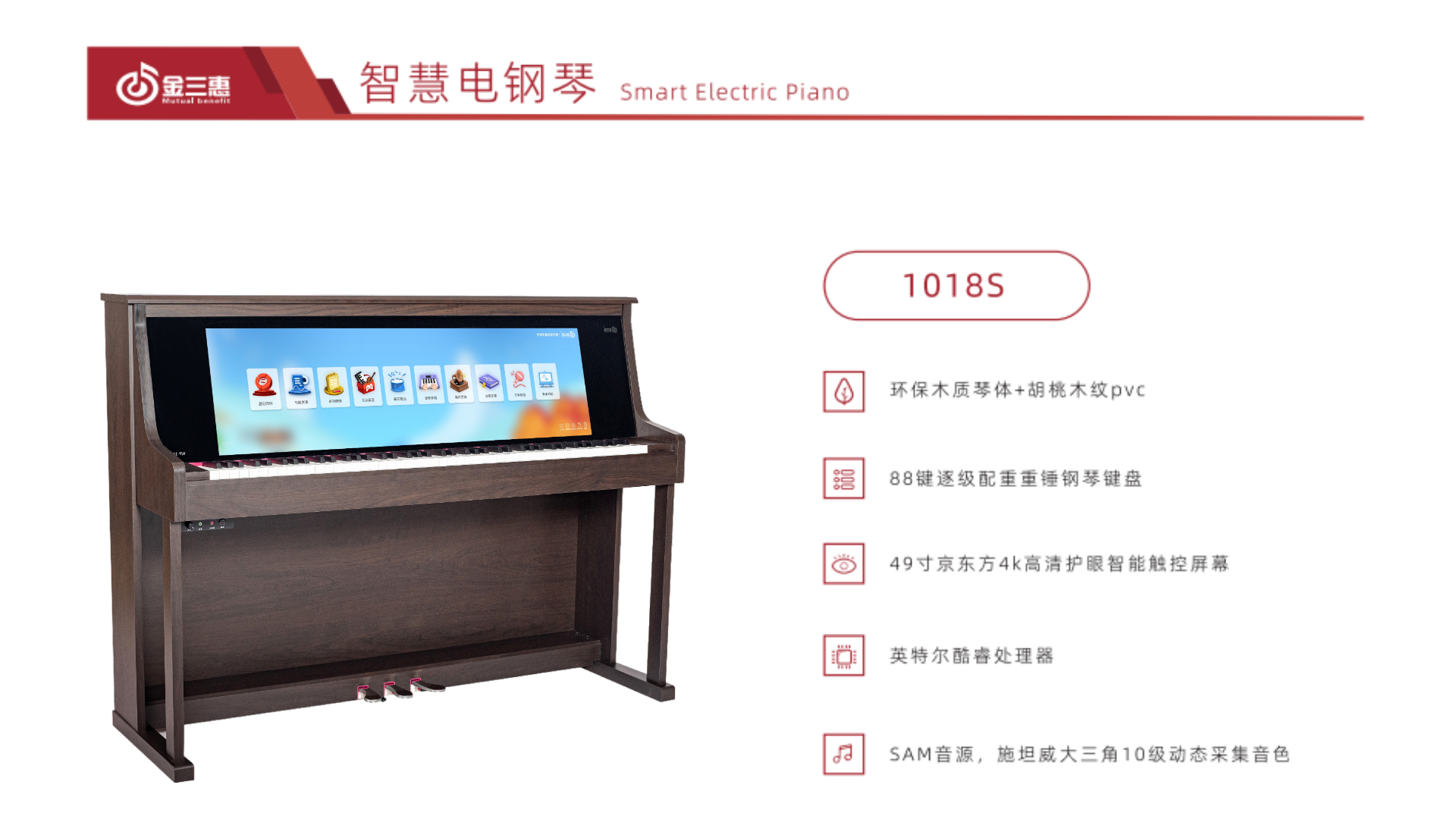 智慧電鋼琴1018S:是金三惠工廠生產(chǎn)線升級后,推出的第一款重磅產(chǎn)品。采用定制43寸超寬京東方4k高清護眼智能屏,酷睿高性能CPU,施坦威鋼琴原聲采樣音源、AI智能音頻處理器、琴體采用國家一級環(huán)保板材等。