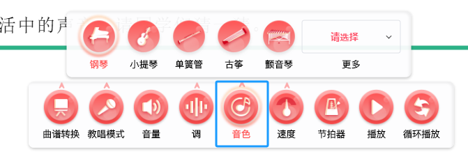 授課學(xué)習(xí)板塊:點(diǎn)擊頁(yè)面下方音色,切換不同樂(lè)器進(jìn)行曲譜演奏。