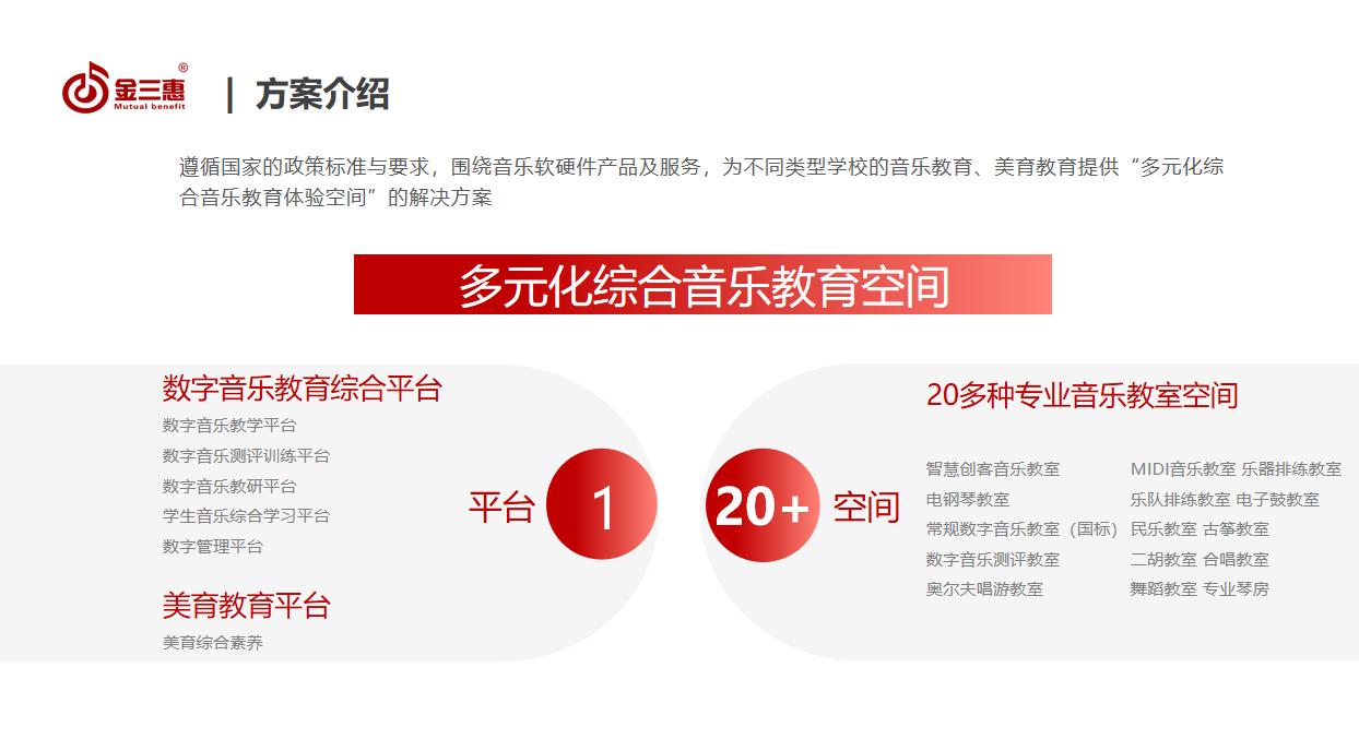 北京金三惠已深耕教育信息化領(lǐng)域十余年,以“同在藍(lán)天下,共享音樂夢(mèng)”為使命,秉承著產(chǎn)品+服務(wù)為核心的理念,專注于數(shù)字化音樂教育領(lǐng)域,為客戶提供成熟完善的一站式全學(xué)段音樂教學(xué)、學(xué)習(xí)綜合解決方案,新常態(tài)音樂教室解決方案。
