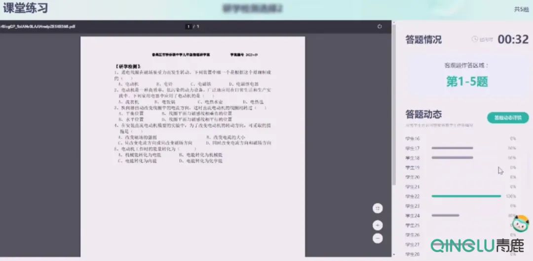 基于青鹿智慧紙筆系統(tǒng)開展的習(xí)題訓(xùn)練活動(dòng),系統(tǒng)實(shí)時(shí)顯示每位學(xué)生答題進(jìn)度、呈現(xiàn)題目批改結(jié)果,老師可以即時(shí)獲取學(xué)生知識(shí)掌握情況,精準(zhǔn)把控課堂時(shí)間。