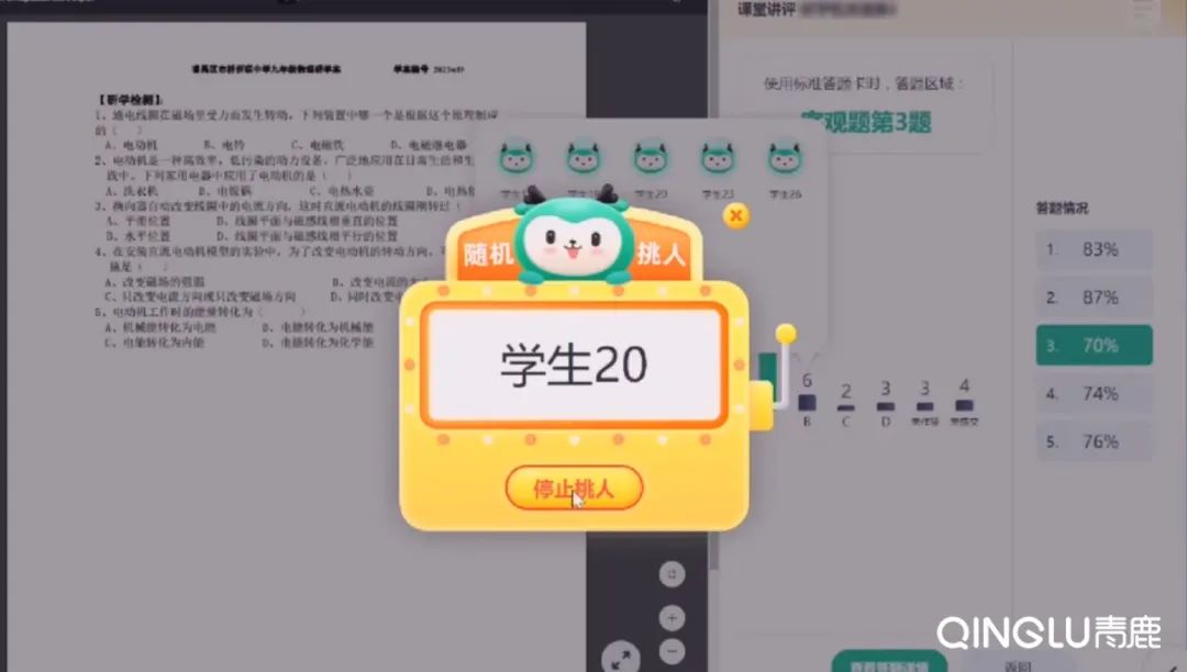 系統(tǒng)支持老師對(duì)作答某一選項(xiàng)的學(xué)生進(jìn)行隨機(jī)挑人互動(dòng),老師可以有針對(duì)性地發(fā)起提問(wèn),了解學(xué)生的作答思路,及時(shí)釋疑解惑,提高教學(xué)效率。