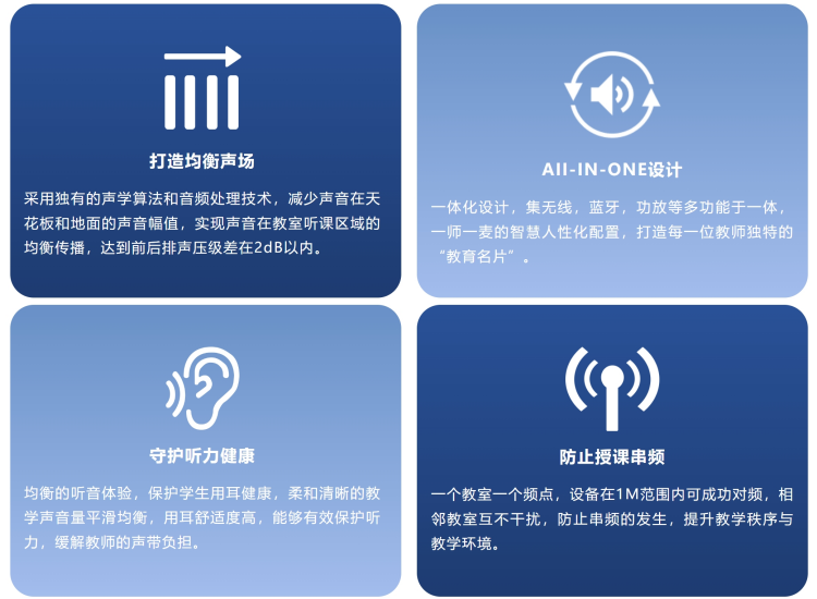 相比以往傳統(tǒng)的擴(kuò)音設(shè)備,清聽(tīng)聲學(xué)教室均衡聲場(chǎng)系統(tǒng)(教室擴(kuò)音系統(tǒng))極大地改善了老師們高負(fù)荷用嗓問(wèn)題。老師只需要用正常音量的嗓音說(shuō)話,后排同學(xué)也能聽(tīng)清。用創(chuàng)新聲學(xué)設(shè)備輔助教學(xué),不僅改善了教學(xué)環(huán)境,也提高了孩子們對(duì)知識(shí)的吸收率,改善了課堂聲態(tài)。