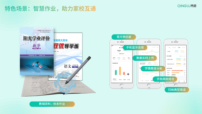 智慧紙筆系統(tǒng)通過(guò)伴隨式采集數(shù)據(jù)的智能筆終端,打通“課前、課中、課后”全流程,連接“家!眻(chǎng)景,實(shí)現(xiàn)對(duì)教學(xué)全場(chǎng)景、全流程的數(shù)據(jù)采集與分析。