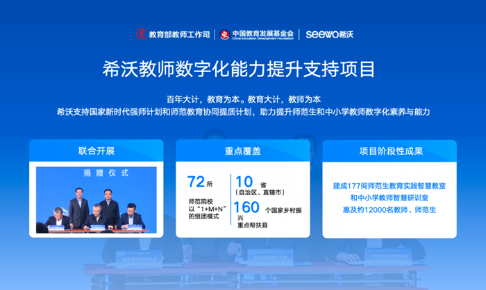 據(jù)悉,希沃還將人工智能的探索應(yīng)用在未來教師培養(yǎng)和國家鄉(xiāng)村振興重點幫扶縣教師群體發(fā)展支持中。自2022年起,由教育部教師工作司、中國教育發(fā)展基金會與希沃聯(lián)合實施的“希沃教師數(shù)字化能力提升支持項目”中,希沃就在探索應(yīng)用軟硬件工具和人工智能技術(shù),助力師范生“職前職后一體化”培養(yǎng),助力國家鄉(xiāng)村振興重點幫扶縣教師發(fā)展“教學(xué)教研一體化”實踐。