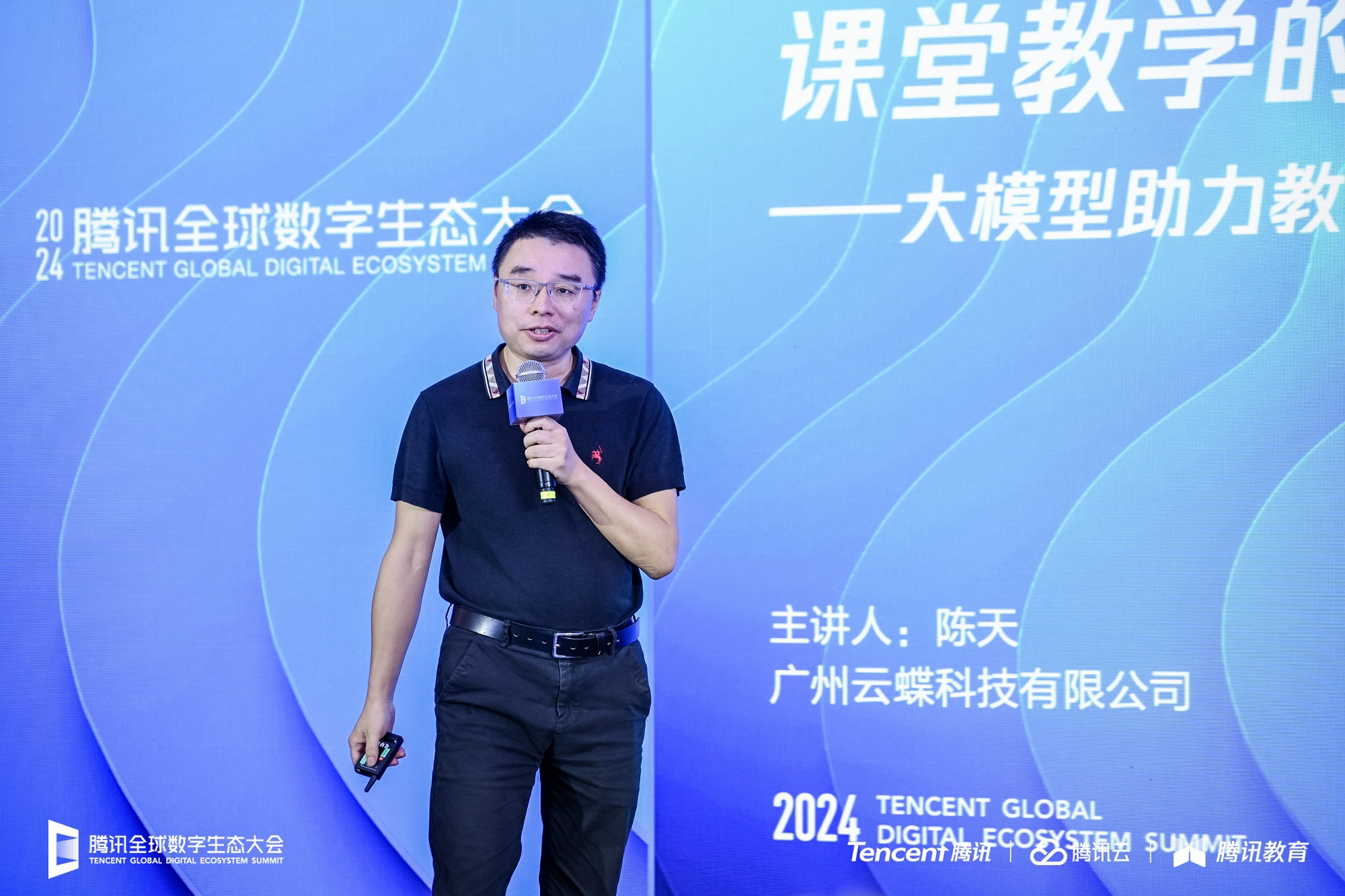 在數(shù)智教育專場(chǎng)活動(dòng)中,陳天博士受邀作主題演講。他以大模型助力教師發(fā)展為主題,介紹了以提升教育教學(xué)質(zhì)量與教師工作效率為目標(biāo),云蝶科技專為教育領(lǐng)域研發(fā)的云蝶教研輔助大模型——云蝶行知大模型。