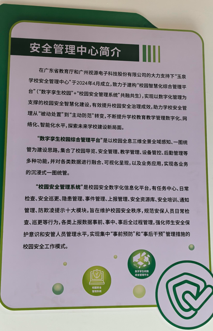 校園安全直接關(guān)系到青少年學(xué)生能否健康地成長(zhǎng),關(guān)系到學(xué)校教育教學(xué)工作能否正常開(kāi)展,同時(shí)也關(guān)系到家庭的幸福安寧和社會(huì)穩(wěn)定。據(jù)介紹,玉泉學(xué)校一直致力于為廣大師生營(yíng)造安全和諧的工作、學(xué)習(xí)和生活環(huán)境。2023年,學(xué)校被廣東省校園安全教育與管理協(xié)會(huì)評(píng)為“廣東省學(xué)校安全教育基地”,這是全省第一所安全教育基地學(xué)校。伴隨著教育數(shù)字化的加速推進(jìn)和人工智能技術(shù)的發(fā)展應(yīng)用,學(xué)校也與希沃在校園安全上開(kāi)展深度合作,共建“玉泉學(xué)校安全管理中心”。