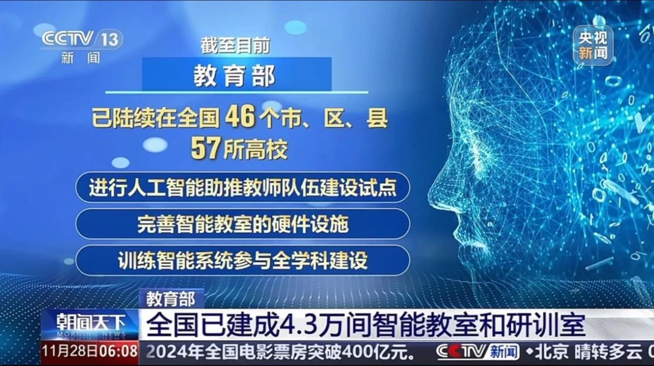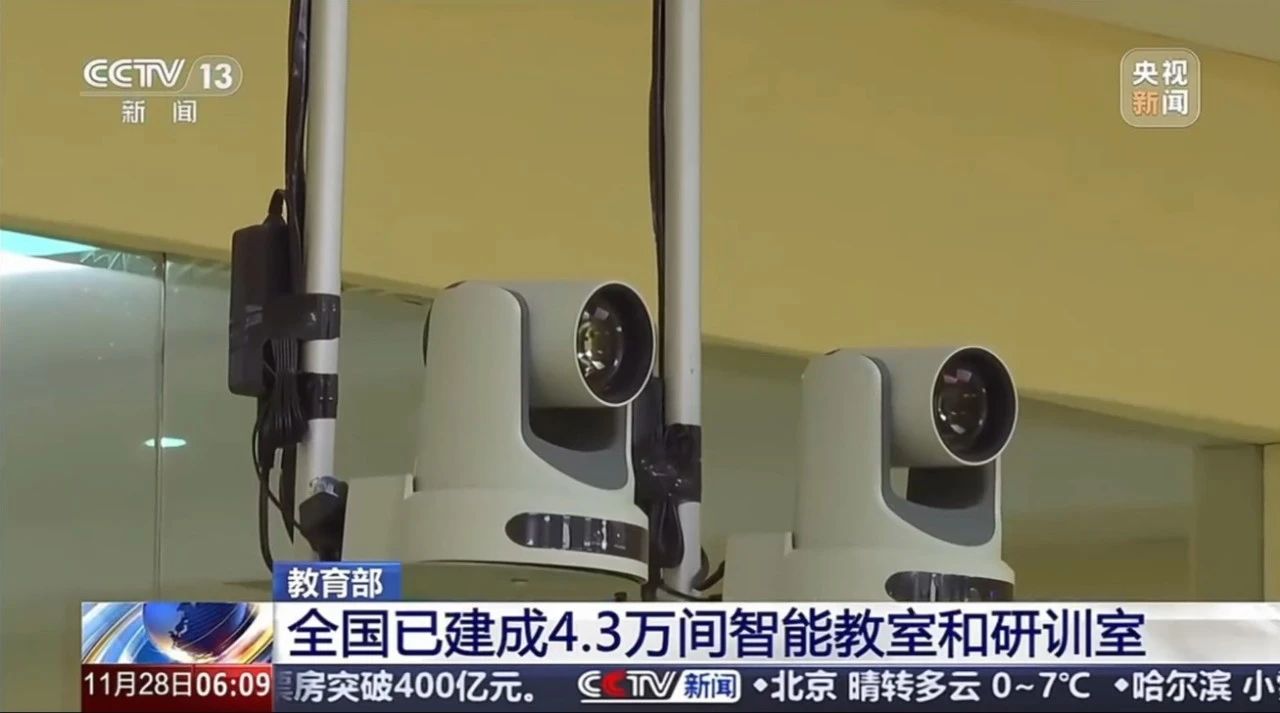 11月28日,中央電視臺《朝聞天下》欄目報道“全國已建成4.3萬間智能教室和研訓室”相關內容。成都市成華區(qū)電子科大附小和英才學校AI課堂場景在報道中出現(xiàn),占據(jù)了整個報道近四分之一的時長。