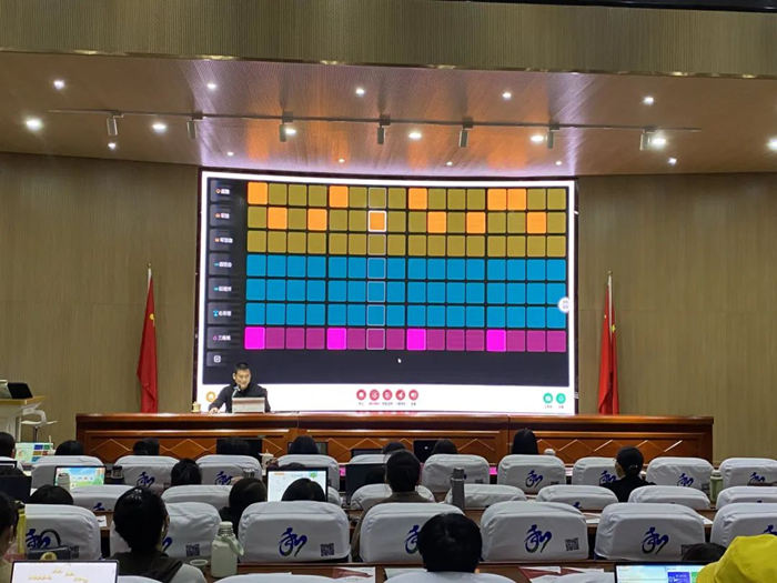 劉浩然老師帶領(lǐng)現(xiàn)場(chǎng)老師共同擊打節(jié)奏曲譜,這種節(jié)奏很難做到準(zhǔn)確的擊打,但運(yùn)用軟件中的節(jié)奏鼓機(jī)可以很好的簡(jiǎn)化這一環(huán)節(jié),將曲譜做成可視化方塊,并通過(guò)不同音色的播放,使節(jié)奏在視聽(tīng)結(jié)合的方式下變得容易。日常教學(xué)中運(yùn)用這個(gè)功能可以簡(jiǎn)化工作流程,提高老師的工作效率。
