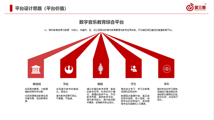 金三惠數(shù)字音樂教育綜合平臺緊跟教育部印發(fā)關(guān)于《關(guān)于全面加強和改進新時代學校美育工作的意見》、《教育信息化2.0行動計劃》、《教師數(shù)字素養(yǎng)》等政策文件,在教育數(shù)字化建設(shè)飛速發(fā)展的趨勢下應運而生,平臺由音樂教學軟件平臺、音樂測評訓練平臺、數(shù)字教學資源、數(shù)字音樂管理平臺組成,是音樂教育管、教、學、評一體化解決方案。