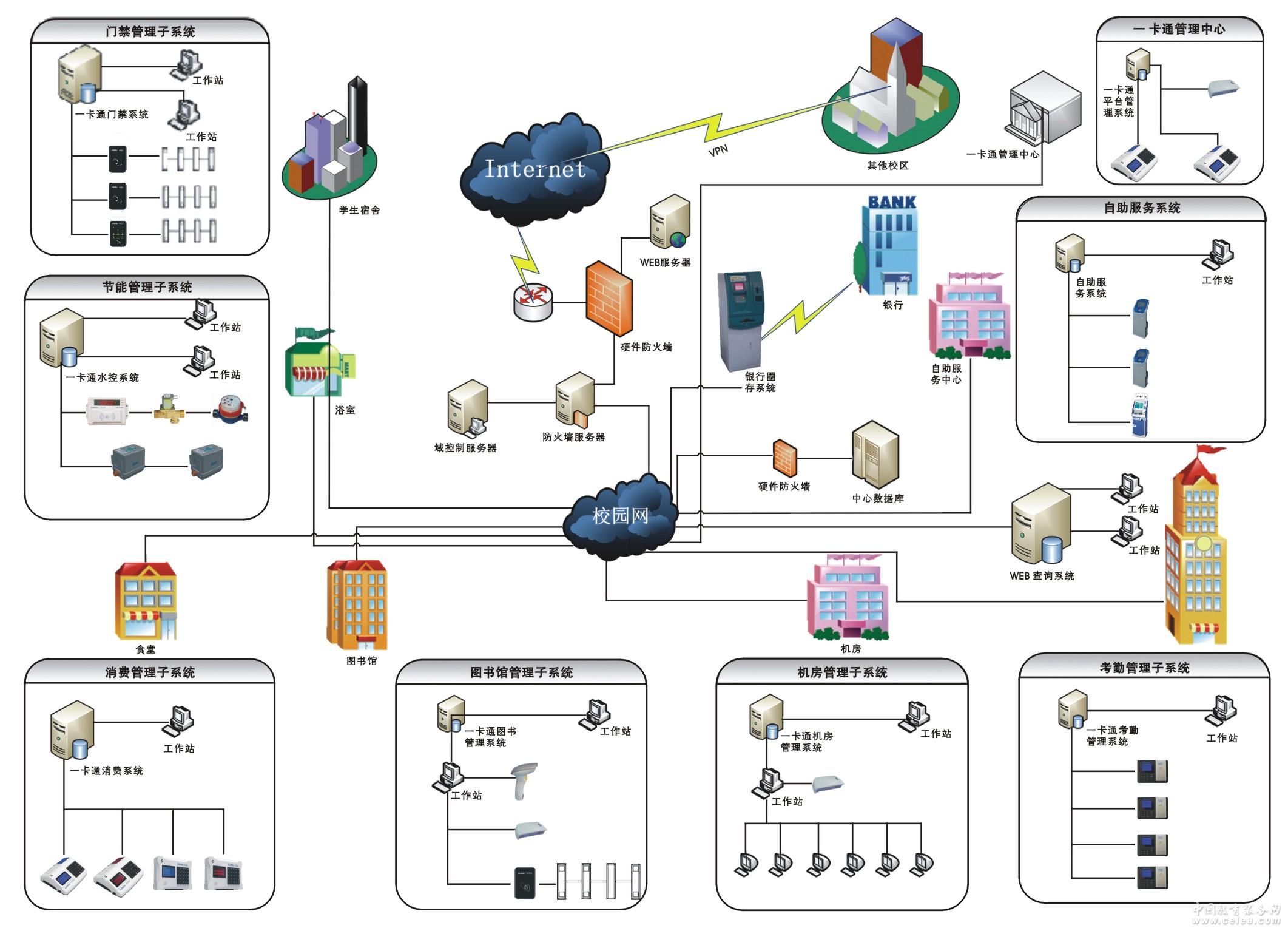 產(chǎn)品詳細(xì)介紹 一卡通系統(tǒng)的突出特點(diǎn)在于“全面、一庫(kù)、一網(wǎng)、一卡、一密”: (1) 全面:我們的校園一卡通系統(tǒng)包含校園管理所需的十余個(gè)子系統(tǒng),基本涵蓋了一卡通在校園的全部應(yīng)用領(lǐng)域。 (2) 一庫(kù):同一軟件平臺(tái)、同一個(gè)數(shù)據(jù)庫(kù)內(nèi)實(shí)現(xiàn)卡的發(fā)放、卡的取消、卡的掛失、卡的資料查詢、黑名單報(bào)警、記錄瀏覽處理統(tǒng)計(jì)等數(shù)據(jù)管理。 (3) 一網(wǎng):一個(gè)統(tǒng)一的網(wǎng)絡(luò)。基于現(xiàn)有的局域網(wǎng)或基于TCP/IP的Internet網(wǎng),系統(tǒng)將多種不同的設(shè)備接入同一個(gè)大型軟件管理平臺(tái), 集中控制,統(tǒng)一管理。 (4) 一卡:指用同一張卡實(shí)現(xiàn)不同功能的智能管理,一張卡通行于很多功能不同的設(shè)備。 (5) 一密:采用DES/MD5/HASH邏輯加密算法,正真實(shí)現(xiàn)一卡一扇區(qū)的加密方式,這樣有力保障了系統(tǒng)的安全性。 4、CARD校園一卡通系統(tǒng)優(yōu)勢(shì) CARD校園一卡通系統(tǒng)擁有自主核心技術(shù)的產(chǎn)品,卡德智能大力倡導(dǎo)并實(shí)施真正意義上的智能一卡通。所有子功能系統(tǒng)在一個(gè)完善的平臺(tái)上有機(jī)結(jié)合,渾然一體,共用一個(gè)統(tǒng)一的數(shù)據(jù)庫(kù)。具備以下的優(yōu)勢(shì): (1) 系統(tǒng)易維護(hù)性高:在一卡通中心集中對(duì)人員、卡及設(shè)備進(jìn)行管理和配置,系統(tǒng)的管理、維護(hù)、用戶的使用、卡片處理等只需操作一次既可完成,無(wú)需多次轉(zhuǎn)換,極為方便; (2) 系統(tǒng)可擴(kuò)展性強(qiáng):CARD校園一卡通系統(tǒng)整合了卡德智能豐富的終端設(shè)備,可以根據(jù)不同用戶的需求靈活配置(擴(kuò)充)不同的子系統(tǒng),實(shí)現(xiàn)多種功能應(yīng)用; (3) 系統(tǒng)高效穩(wěn)定運(yùn)行:各子系統(tǒng)間無(wú)縫互連,數(shù)據(jù)共享,交換快,準(zhǔn)確實(shí)效;全面檢索、實(shí)時(shí)查詢,及時(shí)生成統(tǒng)計(jì)報(bào)表。 5、CARD校園一卡通系統(tǒng)總體建設(shè)目標(biāo) (1) 數(shù)字化校園的目標(biāo):建成“校園卡”系統(tǒng)的骨干平臺(tái),身份認(rèn)證、校內(nèi)消費(fèi)、校務(wù)管理的各個(gè)子系統(tǒng)都建在該平臺(tái)下,以后隨學(xué)校規(guī)模的擴(kuò)大和卡片功能的增加只需增加子系統(tǒng),實(shí)現(xiàn)校園數(shù)字化的目標(biāo); (2) 一卡通的目標(biāo):每個(gè)學(xué)生或教職員工一張卡,此卡集身份卡、借書(shū)卡、消費(fèi)卡、上機(jī)卡、醫(yī)療卡等于一體,代表持卡人的身份,在卡上可自由充值和消費(fèi),在校園內(nèi)做到一卡通用。 (3) 實(shí)現(xiàn)銀校結(jié)合:“校園卡”系統(tǒng)采用邏輯一體、物理分離的校園卡與銀行卡銀行卡在銀行各個(gè)網(wǎng)點(diǎn)通用,進(jìn)行電子貨幣結(jié)算,做到各個(gè)銀行互通。持卡人通過(guò)圈存等方式實(shí)現(xiàn)銀行卡與校園卡之間的轉(zhuǎn)賬功能,賦予“校園卡”系統(tǒng)金融功能,也讓校園卡走出校園。 6、CARD校園一卡通系統(tǒng)主要子系統(tǒng): (1) 一卡通管理中心:包含平臺(tái)管理、人事中心、卡務(wù)中心、結(jié)算中心等四個(gè)子系統(tǒng);完成對(duì)整個(gè)一卡通系統(tǒng)的基本設(shè)置、人員管理、操作授權(quán)、卡片授權(quán)、卡片充值、系統(tǒng)數(shù)據(jù)查詢、財(cái)務(wù)結(jié)算、報(bào)表打印等。 (2) 消費(fèi)管理子系統(tǒng):包括校園餐廳售餐機(jī)以及校園內(nèi)商戶消費(fèi)機(jī)等設(shè)備的管理、黑名單管理、數(shù)據(jù)采集等。通過(guò)擴(kuò)展可應(yīng)用于校園全部非現(xiàn)金交易或收費(fèi)的場(chǎng)合。 (3) 水控管理子系統(tǒng):包括校園水控設(shè)備的管理、黑名單管理、數(shù)據(jù)采集等。 (4) 考勤管理子系統(tǒng):完成班次設(shè)置、人員排班、請(qǐng)假登記等操作;以及考勤結(jié)果的分析統(tǒng)計(jì)和導(dǎo)出報(bào)表等。 (5) 門(mén)禁管理子系統(tǒng):與門(mén)禁機(jī)通訊,控制和管理門(mén)禁機(jī),可實(shí)時(shí)監(jiān)控和查詢門(mén)禁包括出入信息。 (6) 機(jī)房管理子系統(tǒng):可完成上機(jī)排課、自動(dòng)分配機(jī)號(hào)、課時(shí)內(nèi)免費(fèi)、課時(shí)外收費(fèi)等管理,和一卡通系統(tǒng)數(shù)據(jù)庫(kù)聯(lián)機(jī),將收費(fèi)數(shù)據(jù)實(shí)時(shí)寫(xiě)入數(shù)據(jù)庫(kù)。 (7) 圖書(shū)館管理子系統(tǒng):管理員可進(jìn)行相關(guān)的圖書(shū)入庫(kù)、查詢、統(tǒng)計(jì)、打印報(bào)表等管理;用戶持卡片辦理借書(shū)、還書(shū);罰款或賠償收費(fèi)通過(guò)卡片扣取,收費(fèi)數(shù)據(jù)直接寫(xiě)入數(shù)據(jù)庫(kù) (8) 金融服務(wù)子系統(tǒng):校園卡對(duì)應(yīng)銀行帳戶余額查詢、明細(xì)查詢;個(gè)人銀行卡賬戶和校園卡電子錢(qián)包(圈存)或者學(xué)校賬戶(扣款)之間的資金轉(zhuǎn)賬、代收代付。 (9) WEB查詢子系統(tǒng):通過(guò)校園網(wǎng)絡(luò)查詢個(gè)人的消費(fèi)記錄、考勤信息、上機(jī)信息、圖書(shū)館借閱信息,以及修改密碼、掛失卡片等操作。 (10) 自助服務(wù)子系統(tǒng):通常安裝在觸摸屏查詢?cè)O(shè)備上,除可