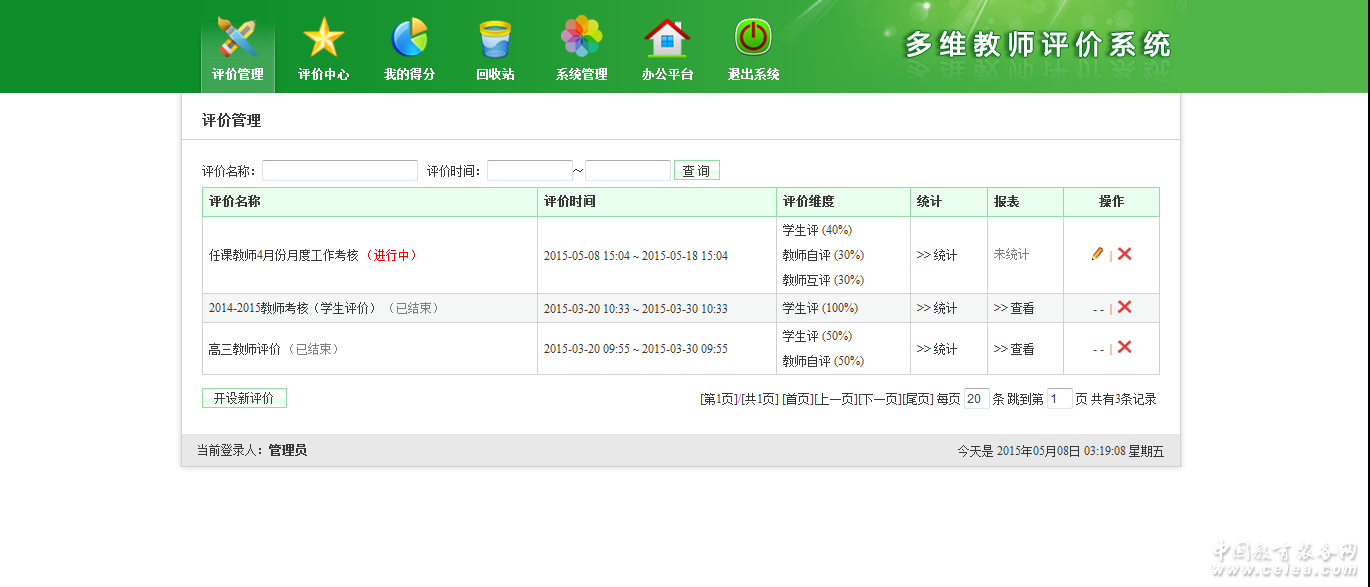 產(chǎn)品詳細(xì)介紹教師專業(yè)發(fā)展性評(píng)價(jià)系統(tǒng)是一套為提高教師的教學(xué)質(zhì)量,反饋學(xué)生的心聲,提高學(xué)校教務(wù)管理能力的系統(tǒng)。針對(duì)各專業(yè)所授課程及教師的評(píng)價(jià)結(jié)果,直觀的統(tǒng)計(jì)出每位教師的綜合能力。其中包含領(lǐng)導(dǎo)評(píng)、專家評(píng)、教師互評(píng)、學(xué)生評(píng)、家長(zhǎng)評(píng)五維一體的評(píng)價(jià)系統(tǒng),并支持去掉最高比例與最低比例值后的最終數(shù)據(jù),真正做到公平、公正、公開。 |