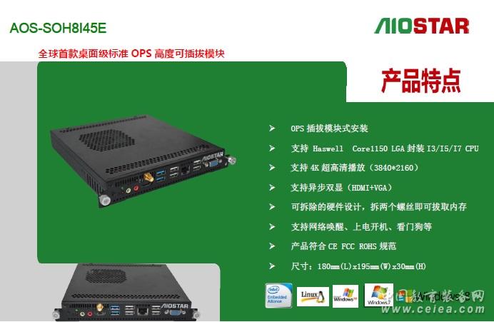 應(yīng)用領(lǐng)域 適用于教育,餐廳,酒店,商場,公司會議,政務(wù)公開等領(lǐng)域。 1概述編輯 Aiostar OPS 全稱為:Aiostar Open Pluggable Specification,開放式可插拔規(guī)范。是Intel與顯示器廠商共同制定的標(biāo)準(zhǔn)化數(shù)字標(biāo)牌接口規(guī)范。OPS內(nèi)部組成是一個X86架構(gòu)的迷你PC,采用英特爾酷睿處理器,配有內(nèi)存、硬盤、多種輸入輸出接口以及Windows操作界面,尺寸為200mm x 119mm x 30mm 。 以下為Intel 官網(wǎng)對于OPS的定義: 原文如下: Digital Signage Open Pluggable Specification :Simplify digital signage development Highlights Enables easier installation, use and maintenance of digital signs. Makes digital signage devices more intelligent and connected. Overview The open pluggable specification (OPS) helps standardize the design and development of digital signage devices and pluggable media players. Intel created OPS to address digital signage market fragmentation and simplify device installation, usage, maintenance and upgrades. OPS enables digital signage manufacturers to deploy interchangeable systems faster and in higher volumes, while lowering costs for development and implementation. Installing digital signage equipment based on Intel architecture helps you implement scalable digital signage applications that can network easily with other equipment. This simplifies interoperability and application upgrades designed to meet the digital signage requirements of individual customers, while helping to future-proof technology investments.[1] 譯文: 強調(diào) 更便于安裝、使用和維護(hù)的數(shù)字信號。 使數(shù)字看板設(shè)備更智能和融合。 概述 開放的可插拔的規(guī)范(OPS)有助于規(guī)范的設(shè)計和開發(fā)數(shù)字看板設(shè)備,并插入媒體播放器終端。Intel創(chuàng)造OPS 致力于數(shù)字看板市場分化和簡化設(shè)備安裝、使用、維護(hù)和升級。 OPS可以使數(shù)字看板制造商更快部署大量的交互系統(tǒng),同時降低開發(fā)和實現(xiàn)的成本。 安裝基于英特爾架構(gòu)的數(shù)字標(biāo)牌設(shè)備可以幫助您實現(xiàn)可伸縮的數(shù)字看板應(yīng)用程序,并且很容易和其他設(shè)備進(jìn)行網(wǎng)絡(luò)連接。這簡化了通過交互和升級的設(shè)計來滿足個人客戶的數(shù)字看板需求,同時有利于面向未來的技術(shù)投資。 2特點編輯 1、支持?jǐn)?shù)字標(biāo)牌等行業(yè)最新的OPS規(guī)范的電腦模塊,加速數(shù)字標(biāo)牌行業(yè)的標(biāo)準(zhǔn)化趨勢。 2、OPS模塊可以簡化設(shè)備的安裝、使用、維護(hù)和更新,幫助數(shù)字標(biāo)牌制造商降低開發(fā)和實施成本。 3、OPS可簡便地與其它設(shè)備聯(lián)網(wǎng),可擴(kuò)展數(shù)字標(biāo)牌應(yīng)用,滿足數(shù)字標(biāo)牌對交互和應(yīng)用更新的需求。 4、部分OPS平臺支持遠(yuǎn)程管理及低功耗模式,解決耗電及散熱要求。同時平臺所支持的Intel vPro、AMT遠(yuǎn)程管理技術(shù),實現(xiàn)設(shè)備無人操控下的高效運作。如采用四代i5+Q87平臺的AOS-SOQ8I45A 5、OPS無風(fēng)扇散熱設(shè)計,提供超靜音的解決方案,保證工作環(huán)境的安靜、清爽。發(fā)熱量小也帶來了較小的功耗。 3整機編輯 Intel 2011年提出該規(guī)范后,伴隨著日本NEC OPS接口顯示器的上市,傳統(tǒng)數(shù)字標(biāo)牌嵌入式主板走下神壇,OPS模塊化正式開啟。代表作品有 愛鑫微電子(AIOSTAR) AOS-SOH8I45A ,