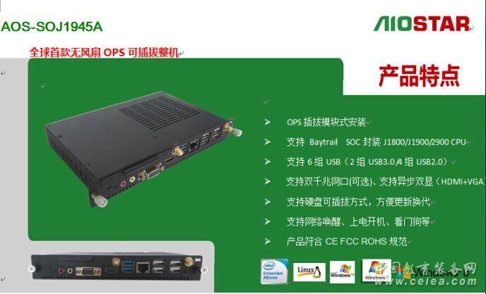 1概述編輯 Aiostar OPS 全稱為:Aiostar Open Pluggable Specification,開放式可插拔規(guī)范。是Intel與顯示器廠商共同制定的標(biāo)準(zhǔn)化數(shù)字標(biāo)牌接口規(guī)范。OPS內(nèi)部組成是一個X86架構(gòu)的迷你PC,采用英特爾酷睿處理器,配有內(nèi)存、硬盤、多種輸入輸出接口以及Windows操作界面,尺寸為200mm x 119mm x 30mm 。 以下為Intel 官網(wǎng)對于OPS的定義: 原文如下: Digital Signage Open Pluggable Specification :Simplify digital signage development Highlights Enables easier installation, use and maintenance of digital signs. Makes digital signage devices more intelligent and connected. Overview The open pluggable specification (OPS) helps standardize the design and development of digital signage devices and pluggable media players. Intel created OPS to address digital signage market fragmentation and simplify device installation, usage, maintenance and upgrades. OPS enables digital signage manufacturers to deploy interchangeable systems faster and in higher volumes, while lowering costs for development and implementation. Installing digital signage equipment based on Intel architecture helps you implement scalable digital signage applications that can network easily with other equipment. This simplifies interoperability and application upgrades designed to meet the digital signage requirements of individual customers, while helping to future-proof technology investments.[1] 譯文: 強(qiáng)調(diào) 更便于安裝、使用和維護(hù)的數(shù)字信號。 使數(shù)字看板設(shè)備更智能和融合。 概述 開放的可插拔的規(guī)范(OPS)有助于規(guī)范的設(shè)計(jì)和開發(fā)數(shù)字看板設(shè)備,并插入媒體播放器終端。Intel創(chuàng)造OPS 致力于數(shù)字看板市場分化和簡化設(shè)備安裝、使用、維護(hù)和升級。 OPS可以使數(shù)字看板制造商更快部署大量的交互系統(tǒng),同時(shí)降低開發(fā)和實(shí)現(xiàn)的成本。 安裝基于英特爾架構(gòu)的數(shù)字標(biāo)牌設(shè)備可以幫助您實(shí)現(xiàn)可伸縮的數(shù)字看板應(yīng)用程序,并且很容易和其他設(shè)備進(jìn)行網(wǎng)絡(luò)連接。這簡化了通過交互和升級的設(shè)計(jì)來滿足個人客戶的數(shù)字看板需求,同時(shí)有利于面向未來的技術(shù)投資。 2特點(diǎn)編輯 1、支持?jǐn)?shù)字標(biāo)牌等行業(yè)最新的OPS規(guī)范的電腦模塊,加速數(shù)字標(biāo)牌行業(yè)的標(biāo)準(zhǔn)化趨勢。 2、OPS模塊可以簡化設(shè)備的安裝、使用、維護(hù)和更新,幫助數(shù)字標(biāo)牌制造商降低開發(fā)和實(shí)施成本。 3、OPS可簡便地與其它設(shè)備聯(lián)網(wǎng),可擴(kuò)展數(shù)字標(biāo)牌應(yīng)用,滿足數(shù)字標(biāo)牌對交互和應(yīng)用更新的需求。 4、部分OPS平臺支持遠(yuǎn)程管理及低功耗模式,解決耗電及散熱要求。同時(shí)平臺所支持的Intel vPro、AMT遠(yuǎn)程管理技術(shù),實(shí)現(xiàn)設(shè)備無人操控下的高效運(yùn)作。如采用四代i5+Q87平臺的AOS-SOQ8I45A 5、OPS無風(fēng)扇散熱設(shè)計(jì),提供超靜音的解決方案,保證工作環(huán)境的安靜、清爽。發(fā)熱量小也帶來了較小的功耗。 3整機(jī)編輯 Intel 2011年提出該規(guī)范后,伴隨著日本NEC OPS接口顯示器的上市,傳統(tǒng)數(shù)字標(biāo)牌嵌入式主板走下神壇,OPS模塊化正式開啟。代表作品有 愛鑫微電子(AIOSTAR) AOS-SOH8I45A ,