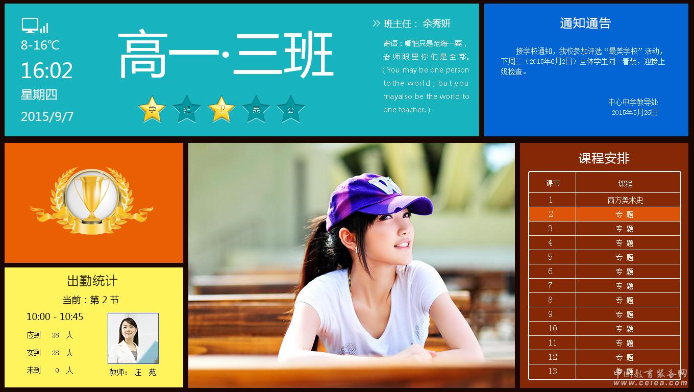 多媒體展示 21.5寸的大屏幕,最核心的區(qū)域用于進行圖片及視頻的展示播放,協(xié)助班級文化建設,無論是活動照片還是每日小知識;無論是名人故事還是學習方法,均可進行發(fā)布展示,并提供圖片庫管理功能。同時也規(guī)劃專門的區(qū)域展示班級信息、榮譽墻、班主任寄語。