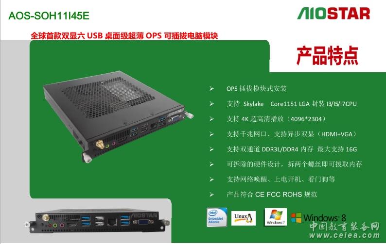 1概述編輯 Aiostar OPS 全稱為:Aiostar Open Pluggable Specification,開放式可插拔規(guī)范。是Intel與顯示器廠商共同制定的標(biāo)準(zhǔn)化數(shù)字標(biāo)牌接口規(guī)范。OPS內(nèi)部組成是一個X86架構(gòu)的迷你PC,采用英特爾酷睿處理器,配有內(nèi)存、硬盤、多種輸入輸出接口以及Windows操作界面,尺寸為200mm x 119mm x 30mm 。 以下為Intel 官網(wǎng)對于OPS的定義: 原文如下: Digital Signage Open Pluggable Specification :Simplify digital signage development Highlights Enables easier installation, use and maintenance of digital signs. Makes digital signage devices more intelligent and connected. Overview The open pluggable specification (OPS) helps standardize the design and development of digital signage devices and pluggable media players. Intel created OPS to address digital signage market fragmentation and simplify device installation, usage, maintenance and upgrades. OPS enables digital signage manufacturers to deploy interchangeable systems faster and in higher volumes, while lowering costs for development and implementation. Installing digital signage equipment based on Intel architecture helps you implement scalable digital signage applications that can network easily with other equipment. This simplifies interoperability and application upgrades designed to meet the digital signage requirements of individual customers, while helping to future-proof technology investments.[1] 譯文: 強調(diào) 更便于安裝、使用和維護的數(shù)字信號。 使數(shù)字看板設(shè)備更智能和融合。 概述 開放的可插拔的規(guī)范(OPS)有助于規(guī)范的設(shè)計和開發(fā)數(shù)字看板設(shè)備,并插入媒體播放器終端。Intel創(chuàng)造OPS 致力于數(shù)字看板市場分化和簡化設(shè)備安裝、使用、維護和升級。 OPS可以使數(shù)字看板制造商更快部署大量的交互系統(tǒng),同時降低開發(fā)和實現(xiàn)的成本。 安裝基于英特爾架構(gòu)的數(shù)字標(biāo)牌設(shè)備可以幫助您實現(xiàn)可伸縮的數(shù)字看板應(yīng)用程序,并且很容易和其他設(shè)備進行網(wǎng)絡(luò)連接。這簡化了通過交互和升級的設(shè)計來滿足個人客戶的數(shù)字看板需求,同時有利于面向未來的技術(shù)投資。 2特點編輯 1、支持數(shù)字標(biāo)牌等行業(yè)最新的OPS規(guī)范的電腦模塊,加速數(shù)字標(biāo)牌行業(yè)的標(biāo)準(zhǔn)化趨勢。 2、OPS模塊可以簡化設(shè)備的安裝、使用、維護和更新,幫助數(shù)字標(biāo)牌制造商降低開發(fā)和實施成本。 3、OPS可簡便地與其它設(shè)備聯(lián)網(wǎng),可擴展數(shù)字標(biāo)牌應(yīng)用,滿足數(shù)字標(biāo)牌對交互和應(yīng)用更新的需求。 4、部分OPS平臺支持遠程管理及低功耗模式,解決耗電及散熱要求。同時平臺所支持的Intel vPro、AMT遠程管理技術(shù),實現(xiàn)設(shè)備無人操控下的高效運作。如采用四代i5+Q87平臺的AOS-SOQ8I45A 5、OPS無風(fēng)扇散熱設(shè)計,提供超靜音的解決方案,保證工作環(huán)境的安靜、清爽。發(fā)熱量小也帶來了較小的功耗。 3整機編輯 Intel 2011年提出該規(guī)范后,伴隨著日本NEC OPS接口顯示器的上市,傳統(tǒng)數(shù)字標(biāo)牌嵌入式主板走下神壇,OPS模塊化正式開啟。代表作品有 愛鑫微電子(AIOSTAR) AOS-SOH8I45A ,