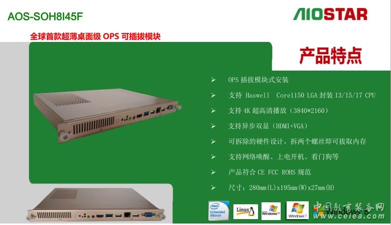 1概述編輯 Aiostar OPS 全稱為:Aiostar Open Pluggable Specification,開放式可插拔規(guī)范。是Intel與顯示器廠商共同制定的標(biāo)準(zhǔn)化數(shù)字標(biāo)牌接口規(guī)范。OPS內(nèi)部組成是一個X86架構(gòu)的迷你PC,采用英特爾酷睿處理器,配有內(nèi)存、硬盤、多種輸入輸出接口以及Windows操作界面,尺寸為200mm x 119mm x 30mm 。 以下為Intel 官網(wǎng)對于OPS的定義: 原文如下: Digital Signage Open Pluggable Specification :Simplify digital signage development Highlights Enables easier installation, use and maintenance of digital signs. Makes digital signage devices more intelligent and connected. Overview The open pluggable specification (OPS) helps standardize the design and development of digital signage devices and pluggable media players. Intel created OPS to address digital signage market fragmentation and simplify device installation, usage, maintenance and upgrades. OPS enables digital signage manufacturers to deploy interchangeable systems faster and in higher volumes, while lowering costs for development and implementation. Installing digital signage equipment based on Intel architecture helps you implement scalable digital signage applications that can network easily with other equipment. This simplifies interoperability and application upgrades designed to meet the digital signage requirements of individual customers, while helping to future-proof technology investments.[1] 譯文: 強調(diào) 更便于安裝、使用和維護的數(shù)字信號。 使數(shù)字看板設(shè)備更智能和融合。 概述 開放的可插拔的規(guī)范(OPS)有助于規(guī)范的設(shè)計和開發(fā)數(shù)字看板設(shè)備,并插入媒體播放器終端。Intel創(chuàng)造OPS 致力于數(shù)字看板市場分化和簡化設(shè)備安裝、使用、維護和升級。 OPS可以使數(shù)字看板制造商更快部署大量的交互系統(tǒng),同時降低開發(fā)和實現(xiàn)的成本。 安裝基于英特爾架構(gòu)的數(shù)字標(biāo)牌設(shè)備可以幫助您實現(xiàn)可伸縮的數(shù)字看板應(yīng)用程序,并且很容易和其他設(shè)備進行網(wǎng)絡(luò)連接。這簡化了通過交互和升級的設(shè)計來滿足個人客戶的數(shù)字看板需求,同時有利于面向未來的技術(shù)投資。 2特點編輯 1、支持?jǐn)?shù)字標(biāo)牌等行業(yè)最新的OPS規(guī)范的電腦模塊,加速數(shù)字標(biāo)牌行業(yè)的標(biāo)準(zhǔn)化趨勢。 2、OPS模塊可以簡化設(shè)備的安裝、使用、維護和更新,幫助數(shù)字標(biāo)牌制造商降低開發(fā)和實施成本。 3、OPS可簡便地與其它設(shè)備聯(lián)網(wǎng),可擴展數(shù)字標(biāo)牌應(yīng)用,滿足數(shù)字標(biāo)牌對交互和應(yīng)用更新的需求。 4、部分OPS平臺支持遠(yuǎn)程管理及低功耗模式,解決耗電及散熱要求。同時平臺所支持的Intel vPro、AMT遠(yuǎn)程管理技術(shù),實現(xiàn)設(shè)備無人操控下的高效運作。如采用四代i5+Q87平臺的AOS-SOQ8I45A 5、OPS無風(fēng)扇散熱設(shè)計,提供超靜音的解決方案,保證工作環(huán)境的安靜、清爽。發(fā)熱量小也帶來了較小的功耗。 3整機編輯 Intel 2011年提出該規(guī)范后,伴隨著日本NEC OPS接口顯示器的上市,傳統(tǒng)數(shù)字標(biāo)牌嵌入式主板走下神壇,OPS模塊化正式開啟。代表作品有 愛鑫微電子(AIOSTAR) AOS-SOH8I45A ,