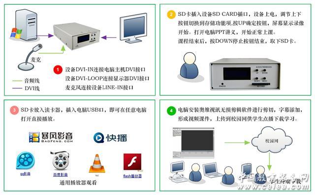 功能描述 可將電腦畫(huà)面和麥克風(fēng)語(yǔ)音同步錄制到SD卡 可將電腦畫(huà)面,老師畫(huà)面,學(xué)生畫(huà)面三路合成同步錄制到SD卡 配套無(wú)損剪輯軟件,可多軌剪切,合并,添加字幕 視頻均可直接作為基礎(chǔ)素材,放到校園網(wǎng)點(diǎn)播 通用文件格式,支持募課MOOC,精品課 保護(hù)教師知識(shí)產(chǎn)權(quán),課件自我錄制、管理,降低工作量 靈活的錄像存儲(chǔ)策略,無(wú)須人工值守操作 |