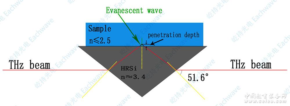產(chǎn)品詳細(xì)介紹產(chǎn)品簡(jiǎn)介 太赫茲是近年來(lái)科研領(lǐng)域一個(gè)非常熱門(mén)的研究方向,太赫茲時(shí)域光譜測(cè)試技術(shù)則是一門(mén)新興的正在蓬勃發(fā)展的技術(shù)。目前國(guó)內(nèi)外物理學(xué)、光學(xué)相關(guān)領(lǐng)域的科研實(shí)驗(yàn)室大多已經(jīng)裝備了太赫茲時(shí)域光譜測(cè)試設(shè)備,進(jìn)行超材料、半導(dǎo)體材料等的研究。然而太赫茲光譜很具特色的生物大分子識(shí)別特性卻很少得到真正的實(shí)際應(yīng)用。 Eachwave推出的太赫茲衰減全反射測(cè)試模塊,主要針對(duì)含水量多的細(xì)胞、組織等樣品,可以通過(guò)衰減全反射的方式測(cè)試出樣品對(duì)太赫茲波譜的吸收譜?梢哉嬲膶⑻掌澆ㄗV的生物大分子指紋識(shí)別特性應(yīng)用于生物樣品的分析測(cè)試中去。讓更多人的生物科研用戶(hù)多了一個(gè)新型的強(qiáng)而有力的樣品分析研究手段。 太赫茲衰減全反射測(cè)試,專(zhuān)門(mén)用于測(cè)試對(duì)入射的太赫茲光譜具有強(qiáng)烈吸收的樣品。太赫茲波段的衰減全反射模塊核心部件是一塊高阻硅(HRSi)棱鏡,HRSi在太赫茲波段(0.1-4THz)具有平坦且很高的折射率,在0.1-4THz,HRSi折射率約為3.416。 如下圖所示,太赫茲光束經(jīng)過(guò)高折射率的高阻硅(HRSi)棱鏡,入射到小折射率的樣品上,在樣品與高阻硅(HRSi)界面全反射,此過(guò)程中,太赫茲(THz)光束會(huì)在樣品中有一定的穿透深度,即全反射過(guò)程中產(chǎn)生的倏逝波會(huì)在樣品中傳播一段距離并最終攜帶樣品的信息反射出來(lái)。通過(guò)這種方法可以測(cè)試對(duì)太赫茲波吸收強(qiáng)烈、不能用常規(guī)透射或反射方法測(cè)試的樣品(如生物樣品、細(xì)胞蛋白質(zhì)等)。