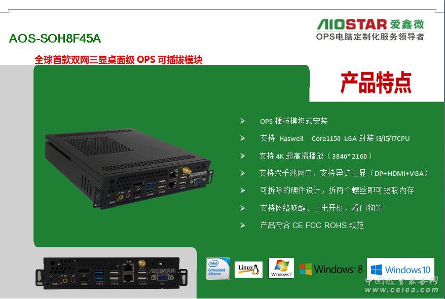 產(chǎn)品詳細(xì)介紹深圳市愛(ài)鑫微電子有限公司為更好的配合不同廠家的要求,可提供OPS主板與OPS準(zhǔn)系統(tǒng)的方案配合各個(gè)廣告機(jī),觸控一體機(jī)廠家,多媒體壁掛式教學(xué)一體機(jī),數(shù)字標(biāo)牌,錄播觸控一體機(jī),同時(shí)保證所提供OPS主板與OPS插拔式電腦/OPS-C插拔式電腦主機(jī)是完全按照INTEL OPS規(guī)范定義的,完全支持鴻合教育一體機(jī)、東方中原教育一體機(jī)、創(chuàng)維教育一體機(jī)、康佳教育一體機(jī)、中銀液晶觸控一體機(jī)、中電數(shù)碼教育一體機(jī)、海爾觸控一體、TCL觸控一體機(jī)、KTC/HKC/HPC等各大交互式教育觸控一體機(jī)廠家,愛(ài)鑫微電子提供專業(yè)的定制化服務(wù)OEM/ODM. 聯(lián)系電話:18620397178 QQ:46078934 現(xiàn)階段我司已推出了一系列OPS電腦方案如下: 頂極OPS插拔式電腦方案:H110+6代CPU+2G獨(dú)立顯卡(GT730/GT850/GT950) 高端:H110+6代CPU (市場(chǎng)最新方案 4K極清方案)歡迎客戶取樣測(cè)試。支持4組USB3.0+3組USB2.0+3組異步顯示(VGA+HDMI+DP)+3組網(wǎng)口(可以直接接IP攝像機(jī)進(jìn)行錄播與監(jiān)控或者網(wǎng)絡(luò)內(nèi)外網(wǎng)隔離進(jìn)行封標(biāo)) 中高端:H81+4代CPU/HM86+4-5代CPU(市場(chǎng)主流) 中端:H61+2-3代CPU/HM65+2-3代CPU(高性價(jià)比) 低端:baytrailJ1800/J1900無(wú)風(fēng)扇低成本的OPS電腦(幼教觸控一體機(jī)專用) 深圳市愛(ài)鑫微電子有限公司(以下簡(jiǎn)稱“AIOSTAR”)是一家集研發(fā)、生產(chǎn)和銷售于一體的高新技術(shù)企業(yè),同時(shí)是Intel、AMD、NVIDIA等芯片廠商緊密的合作伙伴。公司主營(yíng)工業(yè)主板(ITX/3.5寸/NANO等)、媒體播放主機(jī)、OPS主機(jī)、OPS可插拔式電腦模塊、OPS主板、BOX-PC、網(wǎng)絡(luò)安全硬件平臺(tái)、服務(wù)器、工業(yè)平板電腦、一體化工作站等產(chǎn)品。目前,產(chǎn)品已廣泛應(yīng)用于DS、MIDS、IWB、POS、自助查詢、零售金融、工業(yè)自動(dòng)化,智能交通,網(wǎng)絡(luò)信息安全,通訊、智能安防,云計(jì)算、石油石化、醫(yī)療、軍事裝備等多個(gè)領(lǐng)域。公司高度重視客戶的需求和滿意度,針對(duì)不同的客戶需求,能夠快速做出積極的響應(yīng),為其進(jìn)行量身設(shè)計(jì)并提供個(gè)性化的OEM/ODM服務(wù)。 愛(ài)鑫微電子本著以“人才是企業(yè)的財(cái)富,效益是追求的目標(biāo),發(fā)展是永恒的主題”為宗旨;以“客戶至上,品質(zhì)為尊“為原則;提倡“博愛(ài)”“齊鑫”“微天下”的意愿,愿與全球各地的企業(yè)商家攜手合作,共謀發(fā)展! 規(guī)格參數(shù) 處理器 CPU Intel英特爾 Core酷睿 i5-4460 (3.2GHz/6MB/HD4600/22nm/84W/LGA1150) 芯片組 Intel® H81/B85 BIOS AMI 32Mbit,支持無(wú)盤(pán)啟動(dòng)、網(wǎng)絡(luò)喚醒、上電開(kāi)機(jī)、看門(mén)狗等功能 內(nèi)存 容量 4GB SO-DIMM DDR3L 1600 MHz memory , Max.8GB 存儲(chǔ) SATA接口 MINI PCIE 2.5〞5400rpm 500G 1xMini PCIE 顯示 芯片組 輸出