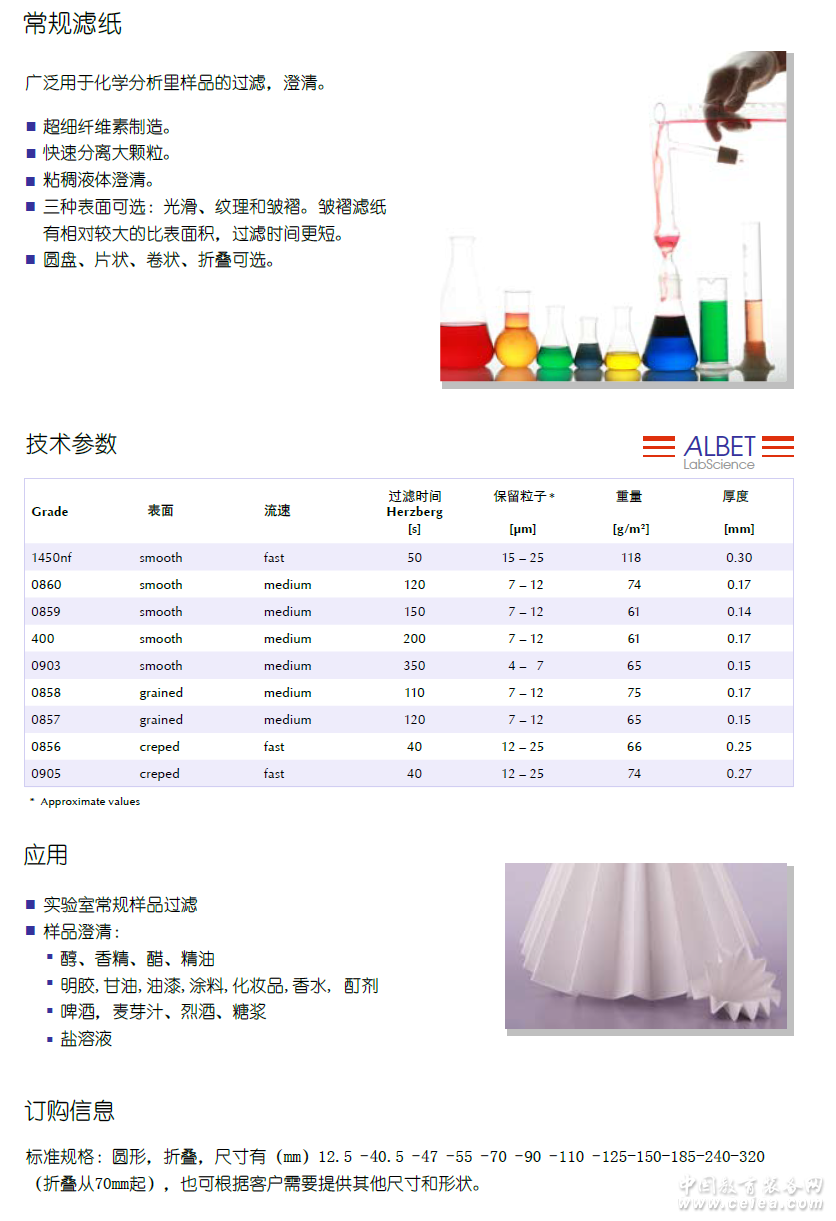 常規(guī)濾紙,廣泛用于化學(xué)分析里樣品的過濾,澄清。 超細(xì)纖維素制造。 快速分離大顆粒。 粘稠液體澄清。 三種表面可選:光滑、紋理和皺褶。皺褶濾紙 有相對較大的比表面積,過濾時間更短。 圓盤、片狀、卷狀、折疊可選。 |
