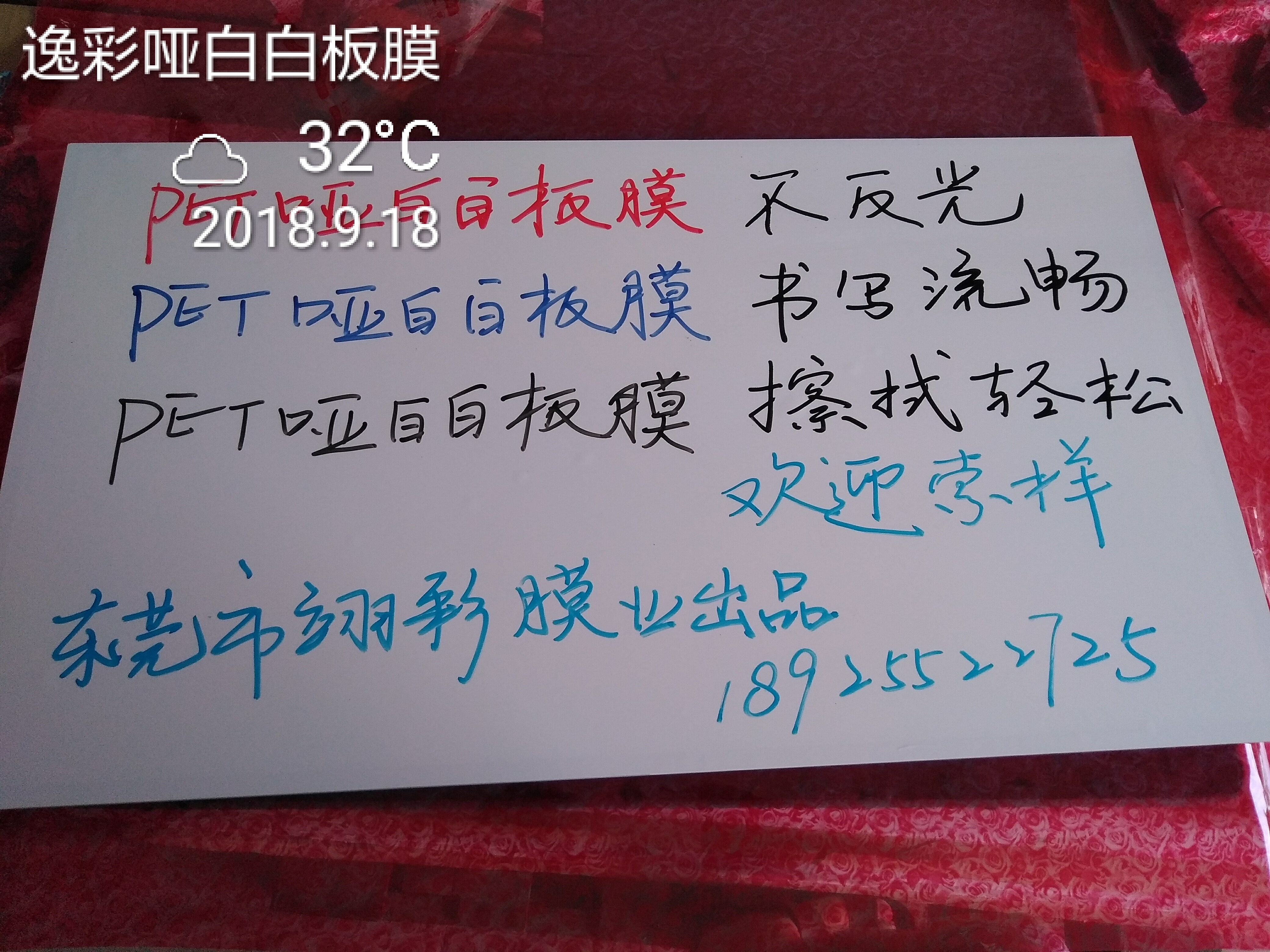 產(chǎn)品詳細(xì)介紹專業(yè)生產(chǎn)銷售磁性軟白板,磁性黑板,透明白板貼膜,純白白板貼膜,泡棉白板膜 啞光書寫膜,可用白板筆反復(fù)書寫,易擦易寫,帶背膠可冷表,不帶膠需要有打膠機(jī)復(fù)合(擦寫不留痕),材質(zhì)PET。其他白板膜,書寫膜可根據(jù)客戶需求定制,歡迎來電索樣。 東莞逸彩彭先生18925522725,微信同號(hào) https:yctm08.1688.com |