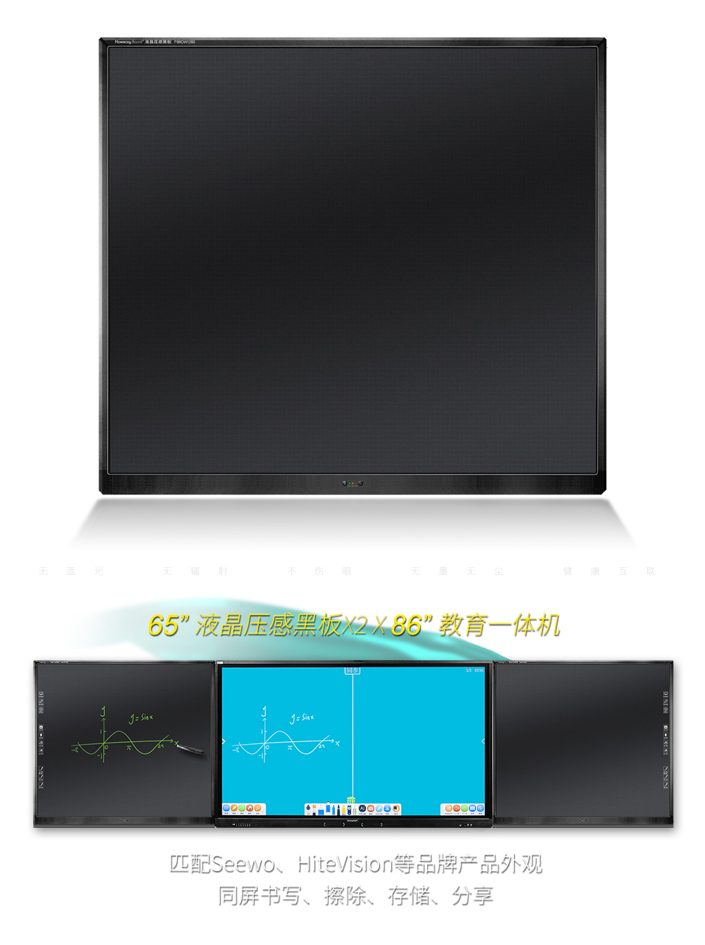 65寸液晶壓感黑板面板貼敷柔性液晶書(shū)寫(xiě)膜,支持壓感書(shū)寫(xiě),甚至是手指直接書(shū)寫(xiě),筆跡粗細(xì)和書(shū)寫(xiě)流暢度,完全媲美傳統(tǒng)粉筆的書(shū)寫(xiě)效果。支持一鍵清除、局部擦除和健康互聯(lián)。無(wú)藍(lán)光、無(wú)輻射、不傷眼,無(wú)墨無(wú)塵。
