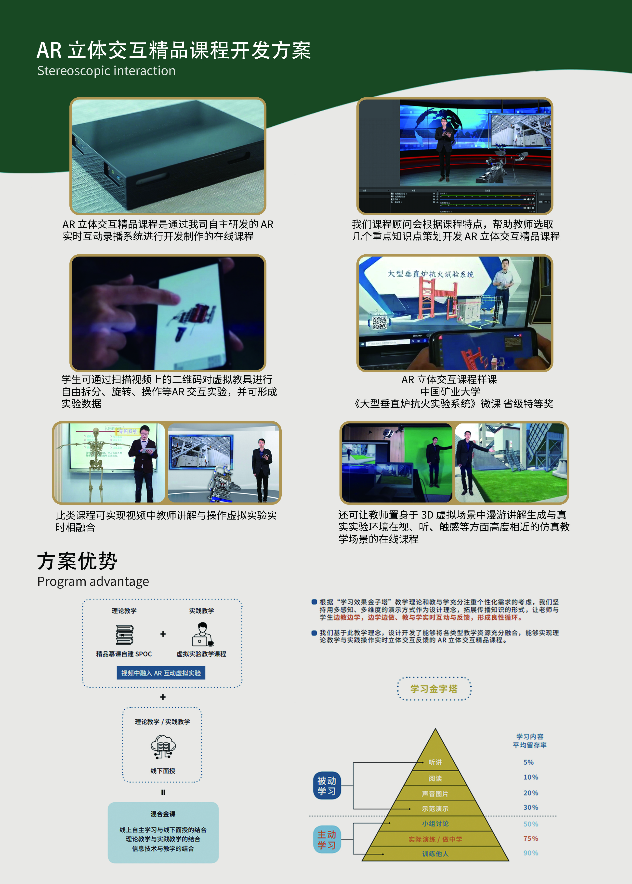 產(chǎn)品詳細介紹AR互動仿真系統(tǒng) 隨著在線學習、移動學習作為新興的教學培養(yǎng)方式,各學校對在線課程資源的制作需求數(shù)量和品質的要求越來越高,因此對在線課程制作的效率和呈現(xiàn)效果提出更高要求。 我司一直致力于服務學校在線教學視頻、動畫、虛擬仿真實驗等各類型課件資源的開發(fā)制作,積累了豐富的開發(fā)經(jīng)驗和高效率的服務團隊。