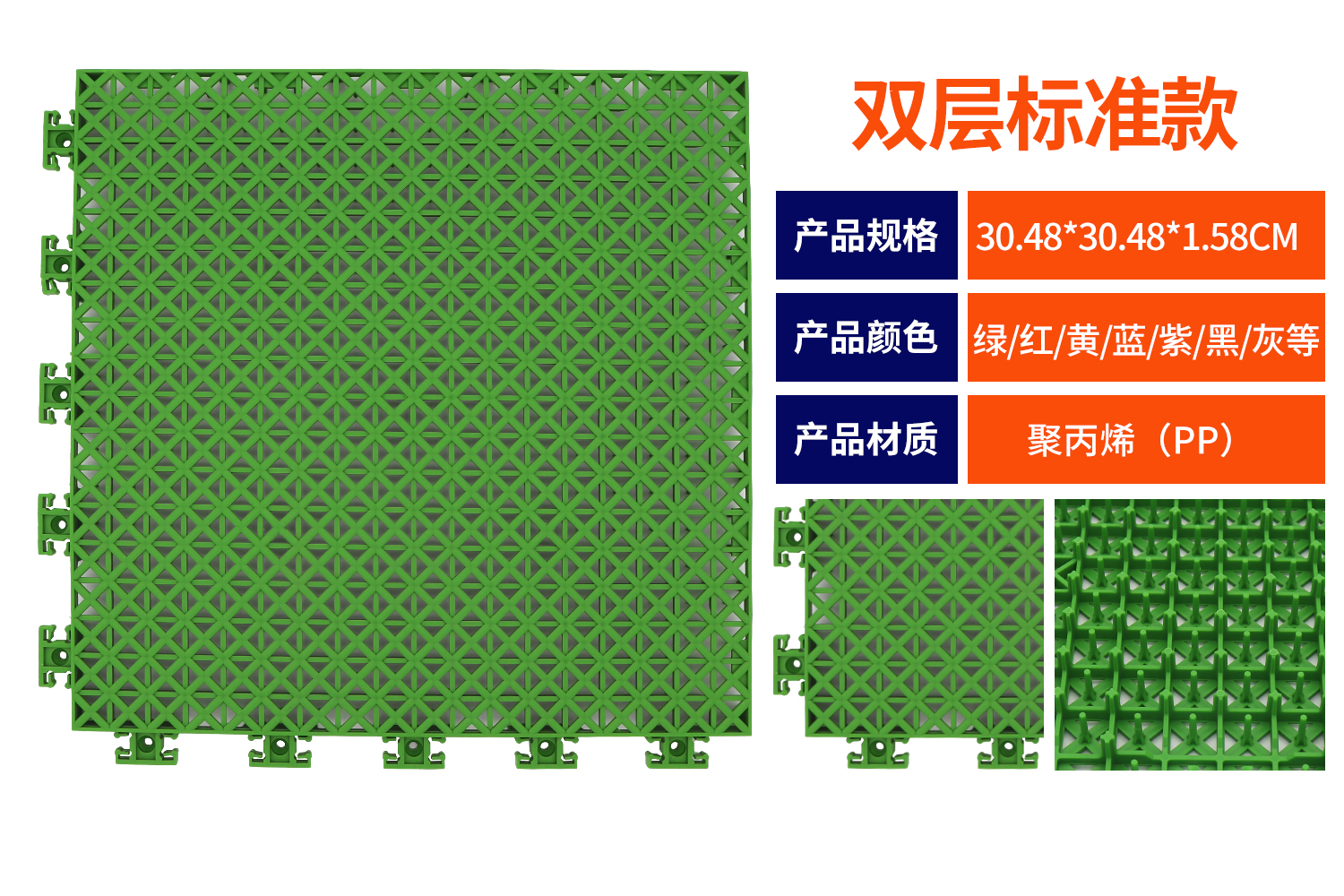 34 (長) ×34 (寬) ×1.58cm (高) 雙層軟連接 單片重量 340g±5 克 2 、材料: 采用食品級全新聚丙烯(PP)高強(qiáng)度改性材料和進(jìn)口助劑生產(chǎn),保證產(chǎn)品環(huán)保性和耐侯性 3 、連接方式: 新型方形彈簧式伸縮扣,有效緩解熱脹冷縮(專利設(shè)計(jì)) 4 、自帶隱藏式連接地面螺絲孔: 防止場地地板走位移動及地板受氣溫影響引起的拉伸和收縮,能使產(chǎn)品定位 于地面,并不影響美觀及無任何安全隱患 5 、面層結(jié)構(gòu): 啞光防眩光表面,強(qiáng)光下不刺眼、不反光,防止地板在日照情況下出現(xiàn)眩光情況; 磨砂曬紋表面,增強(qiáng)地板表層耐磨與防滑度,保證雙重緩沖作用,提升運(yùn)動安全舒適性, 雙層米字棱形鏤空面層,雙層結(jié)構(gòu)使產(chǎn)品的物理性能加強(qiáng),在長時間的戶外鋪裝中,雙層地板的 場地變形基數(shù)遠(yuǎn)低于單面層地板。 6 、底部結(jié)構(gòu): 底部多個加粗加密式十字形懸浮支撐柱,提供垂直緩沖效果, 導(dǎo)水槽結(jié)構(gòu),實(shí)現(xiàn)快速排水,防止場地大面積積水。