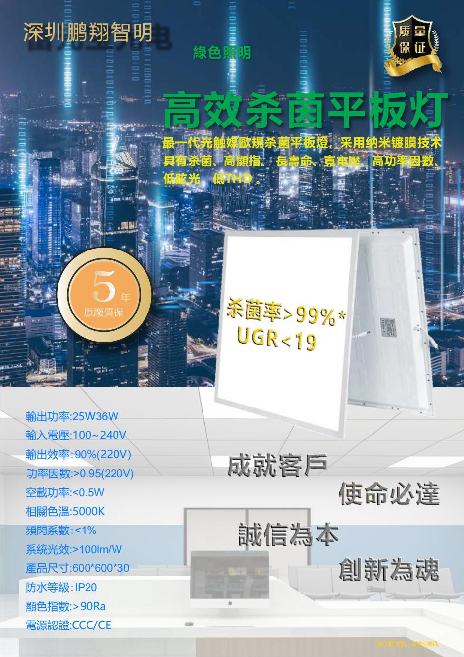 深圳鵬翔智明最一代光觸媒殺菌平板燈,采用納米鍍膜技術(shù)具有殺菌、高顯指、長(zhǎng)壽命、寬電壓、高功率因數(shù)、高顯指、低眩光、無藍(lán)光危害、無頻閃和低THD。