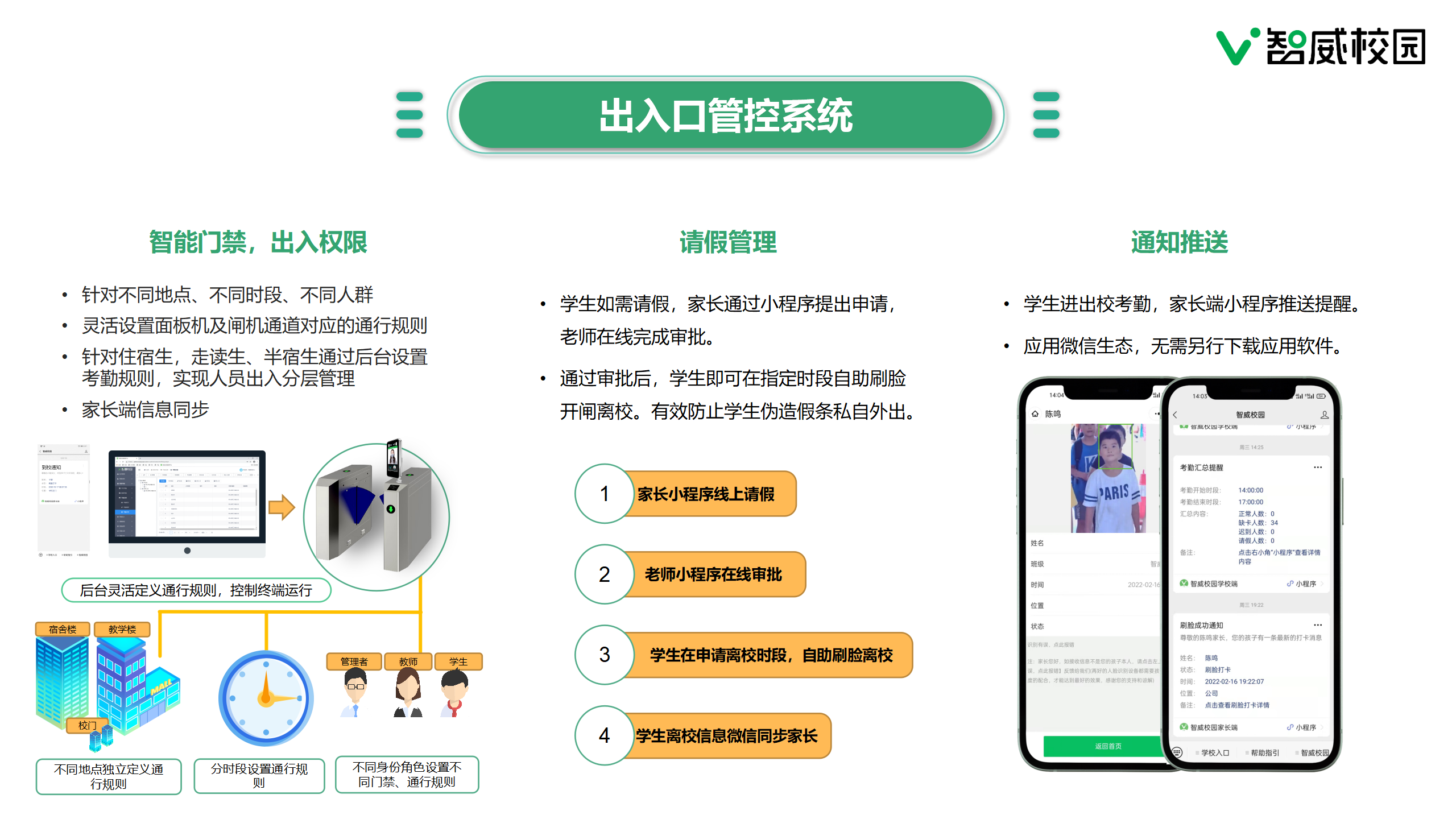 產(chǎn)品詳細(xì)介紹智能門(mén)禁,出入權(quán)限 針對(duì)不同地點(diǎn)、不同時(shí)段、不同人群 靈活設(shè)置面板機(jī)及閘機(jī)通道對(duì)應(yīng)的通行規(guī)則 針對(duì)住宿生,走讀生、半宿生通過(guò)后臺(tái)設(shè)置考勤規(guī)則,實(shí)現(xiàn)人員出入分層管理 家長(zhǎng)端信息同步