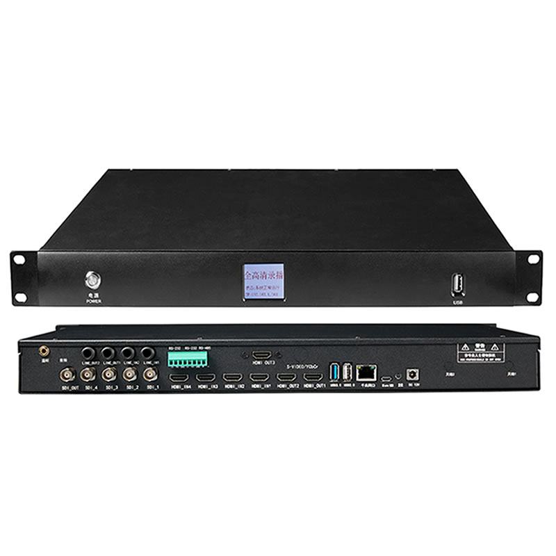 產品主要功能: 1. 系統(tǒng)結構:一體嵌入式結構;1U機架式全鋁機箱;2個內部3.5寸 SATA盤位; 2. 視頻采集:硬件采集方式;視頻輸入接口: HDMI*4(支持4KP30或1080P60)+4*3GSDI/HDSDI;輸入分辨率:640x480 ~ 3840*2160,支持自動偵測分辨率及幀率功能,不但支持常見的4k,1080P60/50,1024x768@60fps等常見的分辨率,也支持1080P25/P30等分辨率 3. 支持2路3.5音輸入或8路輸入都支持HDMI信號帶內嵌音頻,或者SDI信號視頻帶音頻的輸入。 4. 支持2路3.5音頻輸出,支持1個3.5音頻監(jiān)聽接口,支持 4K H265或H264編碼及解碼; 5. 支持2個USB2.0接口,1個接U盤導出文件,1個USB2.0接鼠標,不用接網(wǎng)絡即可直接操控本地回放及文件導出等操作; 6. 支持外接13寸或23寸觸摸屏顯示圖像及觸控,實現(xiàn)所見及所得的導播效果; 7.視頻輸出:3路4K HDMI(其中 1 路支持 4K@60) 8. 錄制格式:MP4; 9. 錄播功能:單獨錄制/同步錄制/同步直播/在線點播/遠程導播/本地導播/互動錄播; 10. 錄播模式:多流多畫面(資源模式)/單流單畫面(電影模式)/單流多畫面(畫中畫); 11. 支持8路rtsp/ts流解碼,分辨率支持4k,解碼流可進行導播后錄制,直播及點播,支持解碼流全屏顯示及聲音單獨輸 12. 支持rtmp/http ts/udp ts/rtsp直播協(xié)議,內嵌rtmp server功能,不需要安裝fms/red5等服務端軟件直接實現(xiàn)網(wǎng)頁直播; 13. 支持瀏覽器直接觀看直播并不用裝插件,支持html5點播; 14. 提供遠程導播軟件,可實時監(jiān)控8畫面并實時導播一路導播流,并實時錄制,且同時支持網(wǎng)頁按紐導播; 15. 支持疊加2行字幕疊加,每行字幕可設置開關,字體大小,色彩,坐標,并能支持中英文;支持字幕滾動功能。 16. 支持透明背景l(fā)ogo圖片疊加, 17.支持常用特技功能,包括摳像 、淡入淡出等功能; 18.無縫切換,支持單畫面與單畫面切換;支持單畫面與畫中畫、1/2/3/4/5/6 分屏切換,支持分屏與分屏之 間切換 切換特效:支持淡入淡出、及 8 鐘以上不同切換特效功能 19.支持跟蹤攝像機接入自動導播功能 20. 每路錄制文件及直播流均支持1080p60幀H265或H264編碼,幀率提高一倍從而可使效果得到極大的提升,徹底消滅切幀現(xiàn)象;HDMI支持4k分辨率及4k分辨率直播,錄制及點播; 21. 支持開機就錄,硬盤錄滿會自動循環(huán)覆蓋時間最老文件,支持自動分段且分段時間可設置,徹底實現(xiàn)無人值守的全自動錄播;支持ftp自動上傳至指定帳號及密碼的ftp服務器; 22. 支持軟件開關機功能,無需重啟錄播即可通過軟件實現(xiàn)開機、關機、重啟等功能, 23.程序固化在內置芯片中,穩(wěn)定高效,使用嵌入式Linux系統(tǒng),不會中毒,可隨時斷電及長時間開機。 24. 支持多級用戶管理,分管理員用戶和一般用戶 25. 網(wǎng)絡媒體直播延時:<=3秒 主要應用: 教學錄播,常態(tài)錄播,精品錄播 、會議錄播 醫(yī)療示教導播臺/多機位直播/錄制 1.2 產品規(guī)格 設備參數(shù) 性能指標 操作語言 中文 操作界面 圖形化菜單操作界面 系統(tǒng)結構 嵌入式 Linux 系統(tǒng) B/S 架構 本地操控一 HDMI 顯示器 + USB 鼠鍵(實時視頻預覽設換) 遠程操控二 IE//火狐/搜狗/360 等瀏覽器上 IP 登陸 系統(tǒng)維護及升級 遠程網(wǎng)絡升級。 視頻輸入接口 4路4K HDMI + 4路3G-SDI(1080P60) 輸入分辨率/幀 所有通道輸入視頻時自動檢測分辨率及幀率輸入。分辨率:3840*2160(HDMI信號輸入)/1920*1080/1280*720@25/30/50/60 視頻輸出接口 3路4K HDMI(其中 1 路支持 4K@60) 輸出信號流 高清數(shù)字信號 H.265/H.264 可選 TS HTTP/UDP/RTSP/RTMP 流 H.265/H.264IP流輸入 最多支持 8 路 1080P 的 H.265 IP流實時輸入,可使用海康/大華/三星/sony 等網(wǎng)絡攝像機輸入。 音頻輸入接口 2路Line in立體聲輸入。支持外置音頻或視頻自帶音頻 音頻輸出接口 2路Line out立體聲輸出,1路監(jiān)聽輸出 音頻編碼格式 AAC 錄音方式 視頻和音頻同步錄制。 播放錄像 通過遠程 IE 瀏覽器網(wǎng)頁方式播放或下載文件后播放。支持本地回放 錄制文件下載 后臺遠程下載或本地U盤拷貝 數(shù)據(jù)存儲模式 內接 2 個 SATA 硬盤 exFAT 分區(qū)、外接 USB 存儲 最大支持單硬盤8TB,支持存儲到 Win 或 NFC 網(wǎng)絡共享路徑。 角標 LOGO 疊加 支持預設四個角標,角標大小和位置可以任意調節(jié)疊加。 OSD 字幕疊加 支持字幕發(fā)布:字幕位置,字體樣式,字號大小可調。 分屏功能 PGM 合成通道支持分屏畫面設換輸出,并提供多種預設樣式選擇功能。 截屏功能 PGM 合成通道視頻的截屏圖像保存 實時切換 所有視頻及流輸入通道能任意兩個無縫切換輸出導播或直播流。
