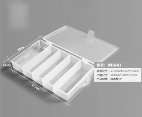 產(chǎn)品編號(hào) 格數(shù) 顏色 蓋子 小格尺寸 規(guī)格 WHB-K1 五格 透明 連蓋 長10cm寬3cm高2.6cm 1個(gè)/包,10個(gè)/盒 WHB-K2 單格 透明 連蓋 長8.4cm寬5.8cm高3.3cm 2個(gè)/包,20個(gè)/盒 WHB-K3 單格 透明 分蓋 長11.7cm寬6.5cm高3.4cm 2個(gè)/包,20個(gè)/盒 WHB-K4 四格 黑色 分蓋 長9.05cm寬3cm高36cm 1個(gè)/包,10個(gè)/盒