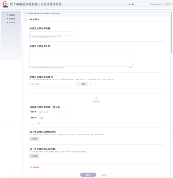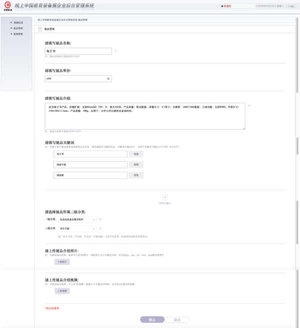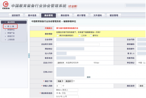為積極響應(yīng)商務(wù)部關(guān)于創(chuàng)新展會(huì)服務(wù)模式,培育展覽業(yè)發(fā)展新動(dòng)能的號(hào)召,經(jīng)第78屆中國(guó)教育裝備展示會(huì)組委會(huì)研究決定,本屆展示會(huì)按照既定計(jì)劃繼續(xù)舉辦線下實(shí)體展,同時(shí)將充分利用人工智能、云計(jì)算、大數(shù)據(jù)等技術(shù),搭建一場(chǎng)永不落幕的“線上展”。為做好本屆展示會(huì)“線上展”數(shù)據(jù)填報(bào)工作,現(xiàn)將填寫要求說明如下: